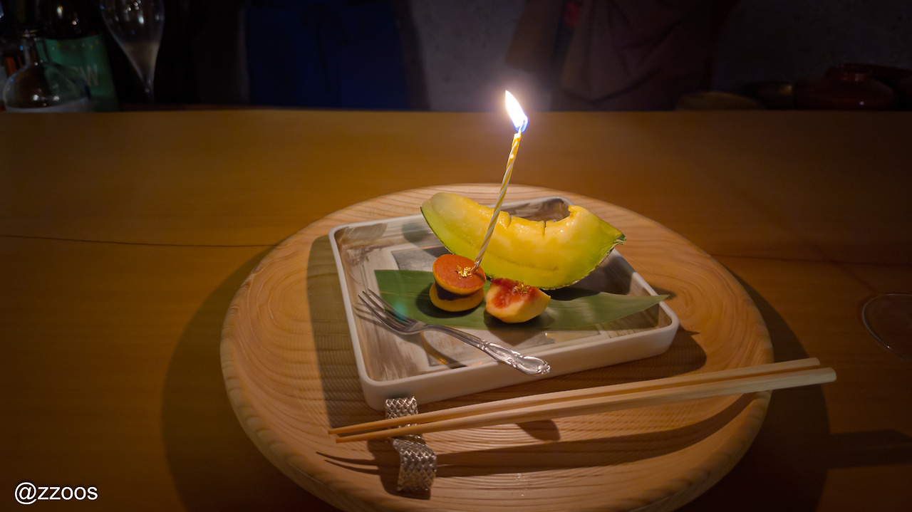 그러다가 갑자기 불이 꺼지길래, 뭐지? 했더니 아... 디저트 플레이트에 초를 하나 켜주셨습니다. 한입 도리야키 위에 켜주신 생일 촛불이라니요. 너무 감사했어요. 모든 직원이 모여서 생일 축하 노래를 불러주셨고, 저는 생일 촛불을 불어서 끌 수 있었습니다. 언제나 건강하길, 이곳에 다시 올 수 있기를 기도했습니다.