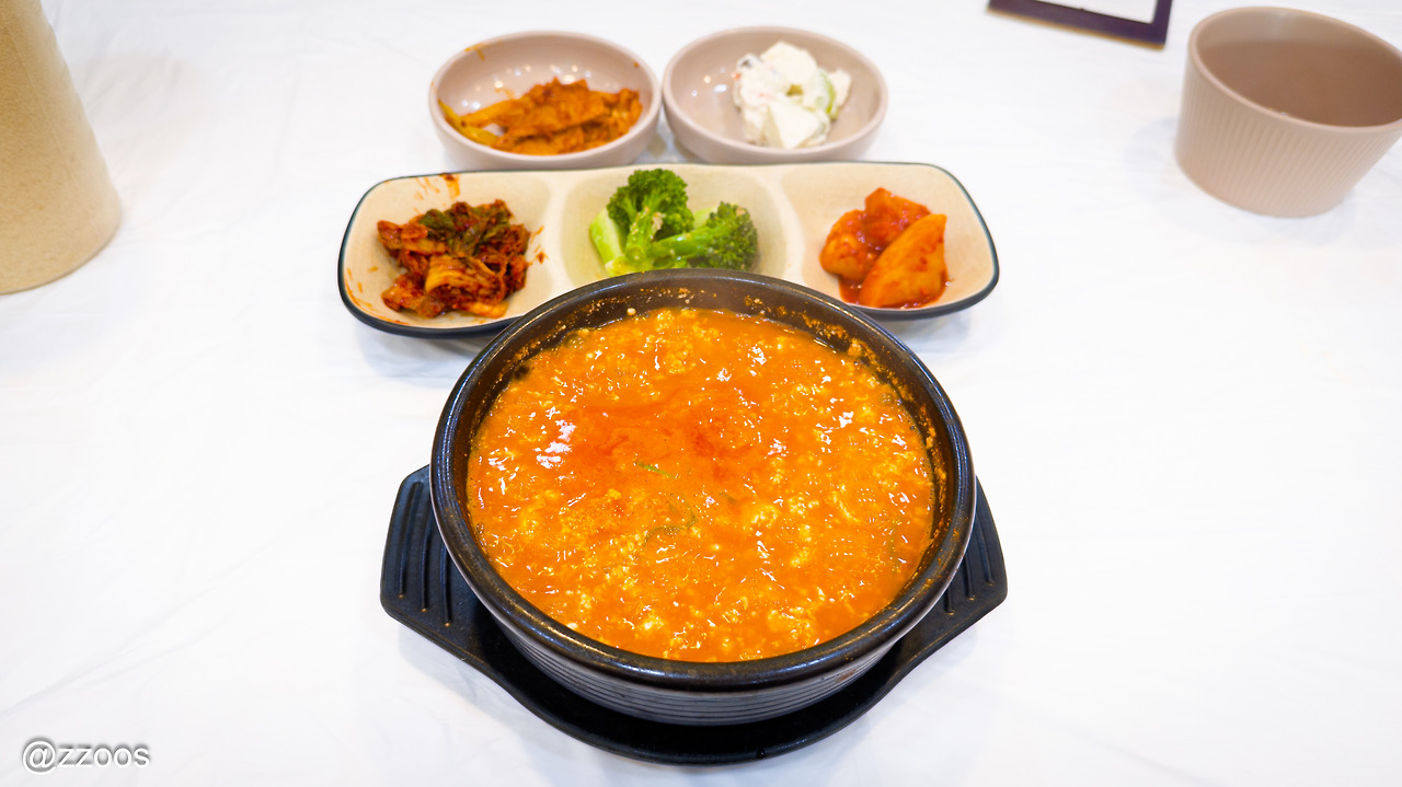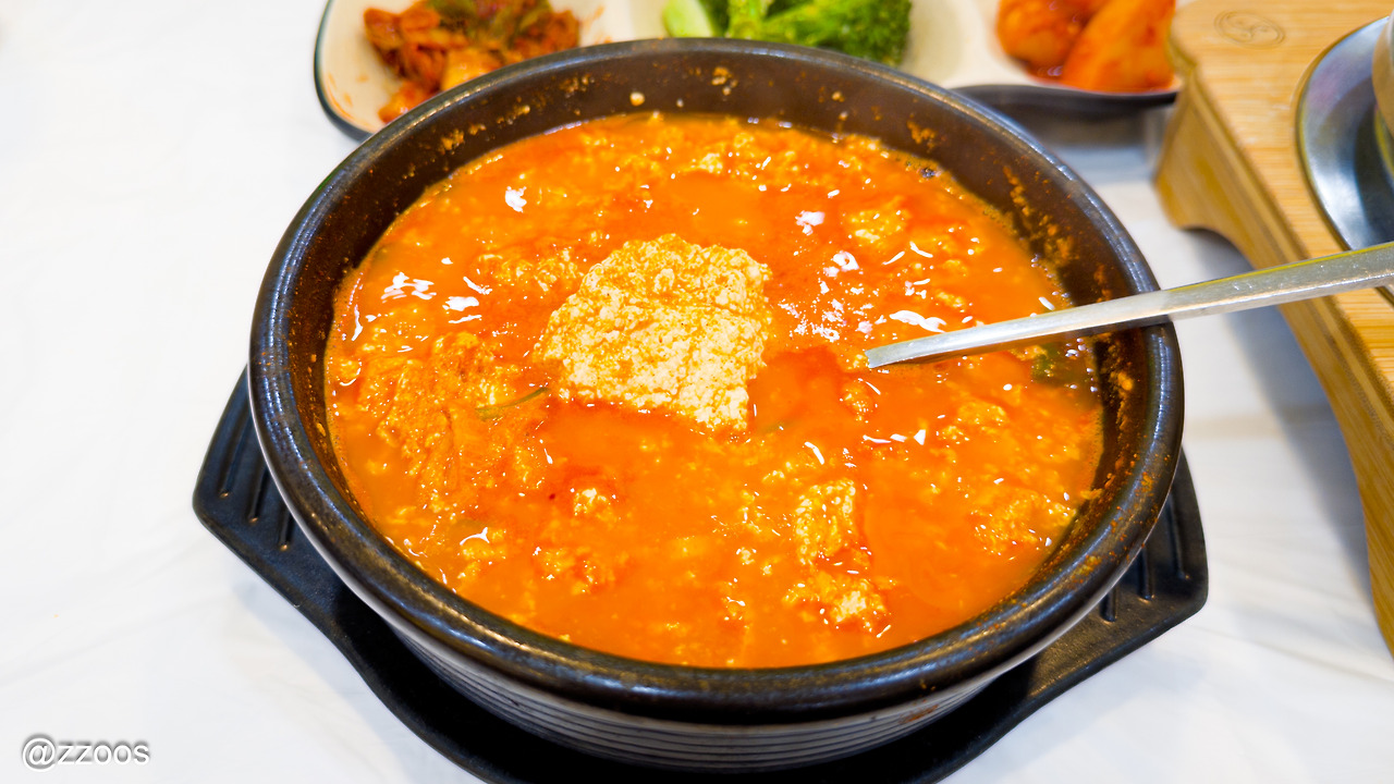 그리고 그리고, 무엇보다도! 순두부. 역시 콩을 전문으로 하는 가게 답긴 합니다. 몽글몽글하면서도 비지 같은 질감도 살아 있는 정말 잘 만든 순두부였어요. 찌개의 양념 때문에 두부 원래의 고소한 맛이 좀 가려지긴 합니다만 과하게 맵지 않은 찌개는 속을 편안하게 해주는 맛이었습니다.