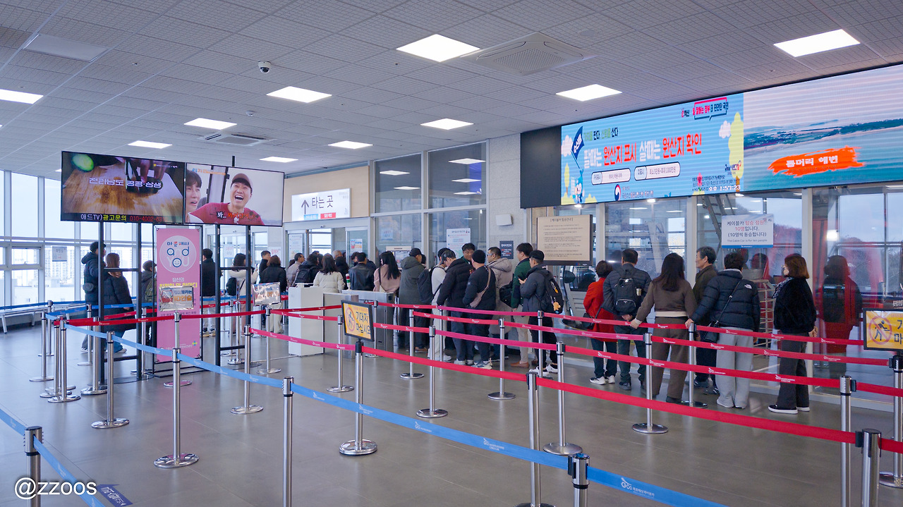 아마 대부분 같은 코스로 움직이시는 것 같았어요. 그래서 북항 탑승장이 가장 붐비는 곳인 것 같더군요. 그나마 겨울이라 평소보다는 사람이 적은 것이 아닐까 하는 생각은 했습니다. 왕복 티켓을 구매할 때에는 줄을 아예 서지 않았고, 탑승을 위해서는 줄을 서야 했지만 줄이 빠르게 줄어들어서 그리 오래 기다리진 않았습니다.