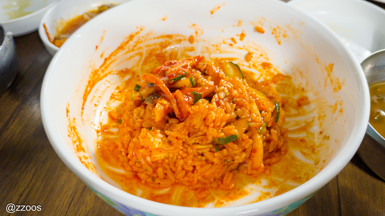 결국 아주머니에게 '비빔그릇'을 하나 달라고 말씀드렸습니다. 그러면 커다란 대접에 참기름을 듬뿍 뿌려서 주시거든요. 거기에 남은 준치회무침과 공깃밥을 넣고 비볐습니다.