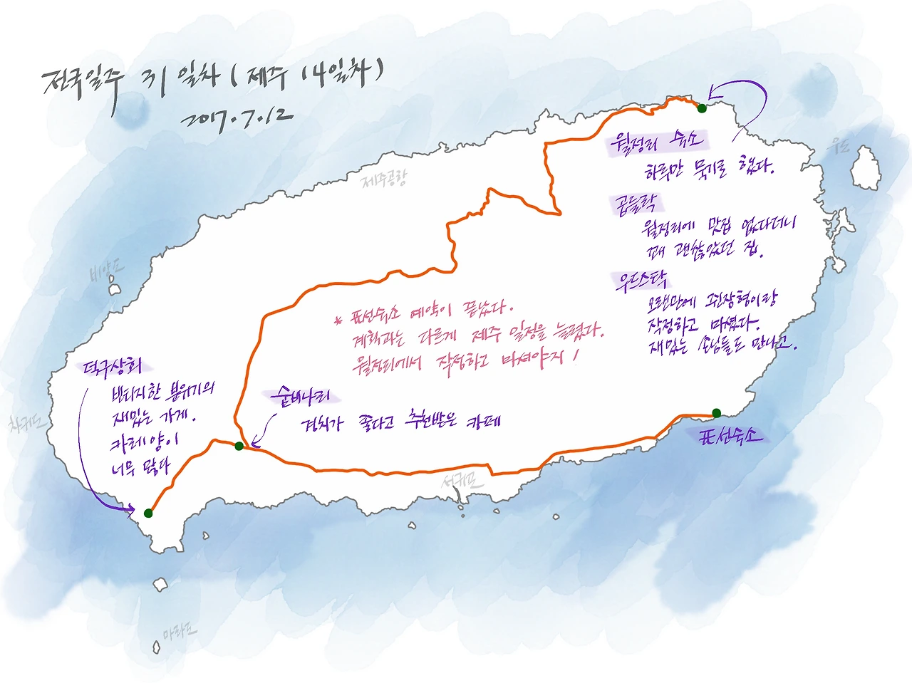 그리고 또 한 가지. 어젯밤 큰 실수를 하나 더 깨달았다. 에어비앤비로 예약했던 표선의 숙소... 예약이 잘못되었다! 예약 기간을 6/28 ~ 7/11으로 설정하면서 7/11까지 숙박을 하고 7/12에 체크아웃을 하는 거라고 생각했는데, (지금 생각하면 너무나 당연하게도) 7/11이 체크아웃이었던 것이다. 오늘이 12일이니까 예약보다 하루를 더 묵은 셈.