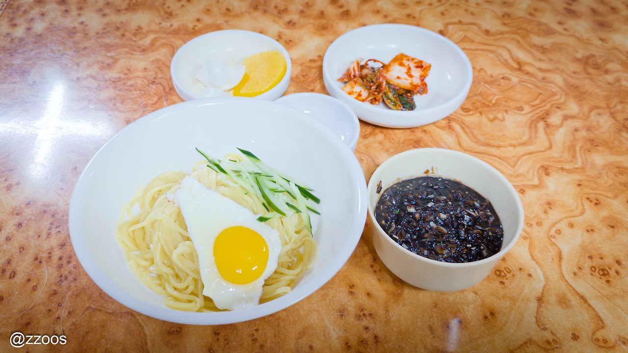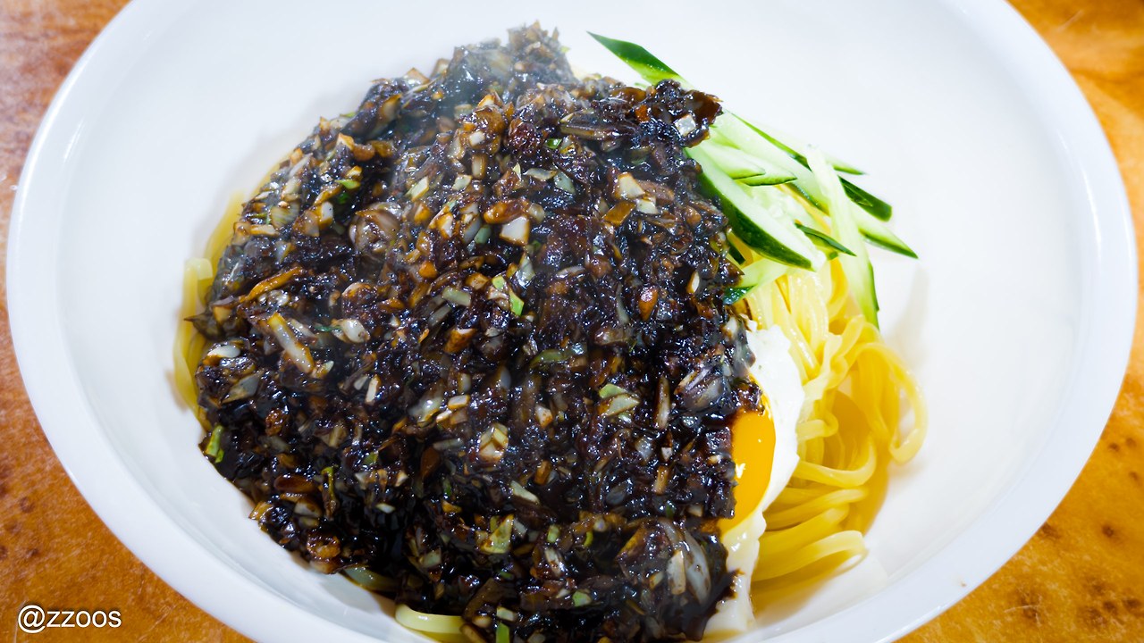 채 썬 오이와 반숙 계란 후라이가 하나 올라가 있는 면 위에 따로 나온 짜장 소스를 부어서 비벼 먹습니다. 면이 평소 먹던 짜장면의 면보다 좀 얇습니다. 소면처럼 얇은 건 아니고 단면이 길쭉한 모양입니다.