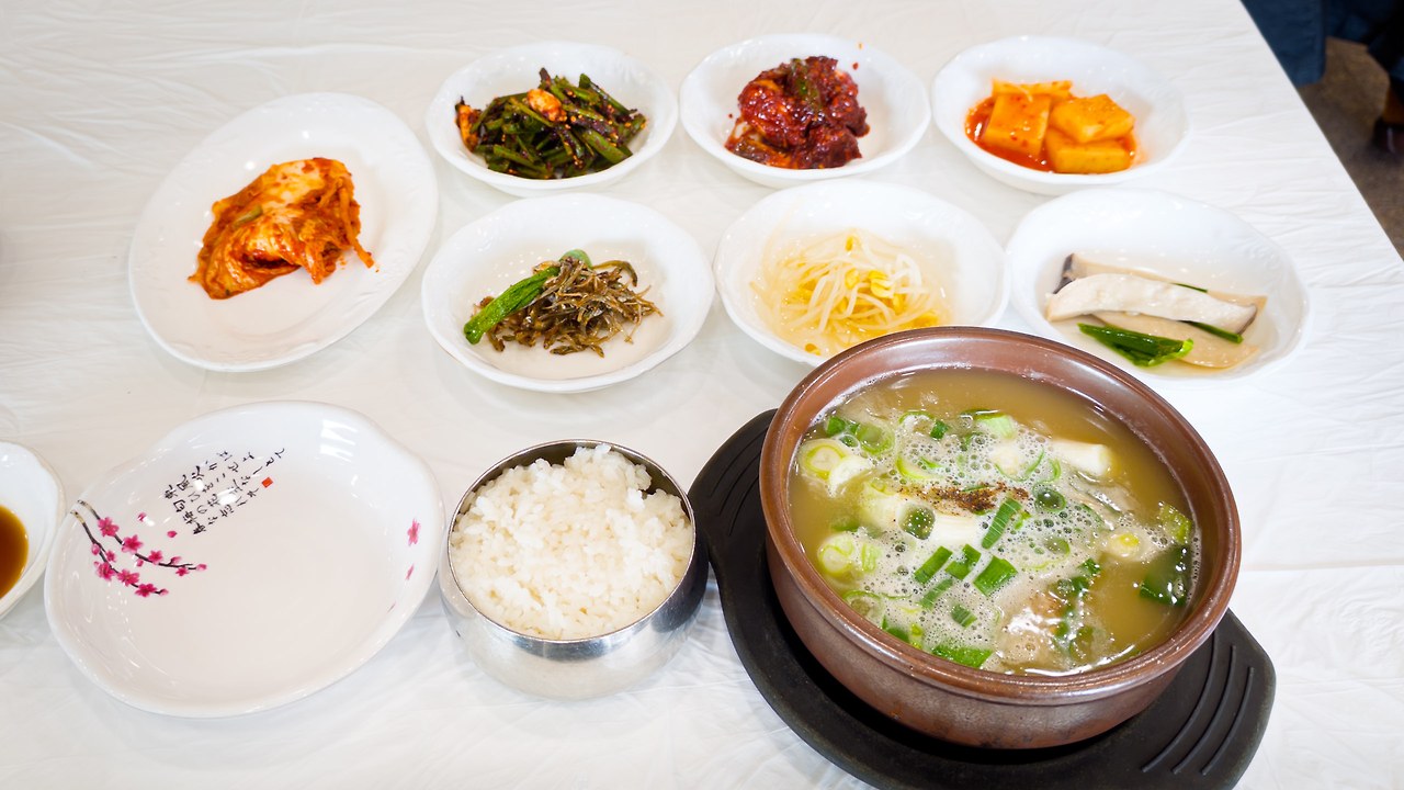 잘 익은 김치, 부추무침, 멸치볶음, 콩나물, 깍두기, 새송이버섯볶음과 양념게장. 그리고 대망의 꼬리곰탕.