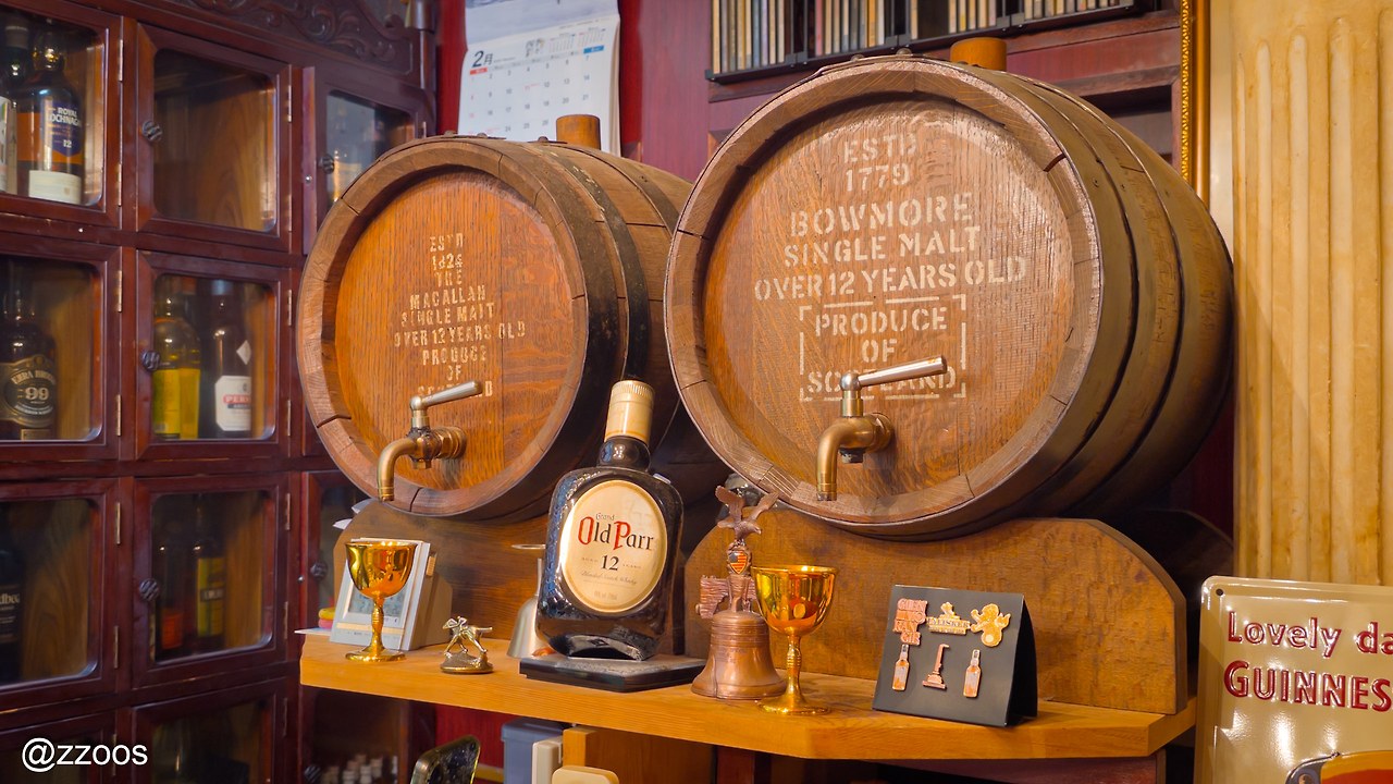 가게 한편에 작은 오크통이 두 개 있었어요. 하나는 맥캘란(Macallan)이라고 쓰여 있고, 다른 하나는 보모어(Bowmore)라고 쓰여 있더라고요. 그래서 이거 정말 술이 들어 있는 거냐고 여쭤봤더니, 처음엔 해당 술을 사 온 것이 맞다고 하네요. 하지만 너무 옛날 일이고, 지금은 그저 장식용이라고 합니다.