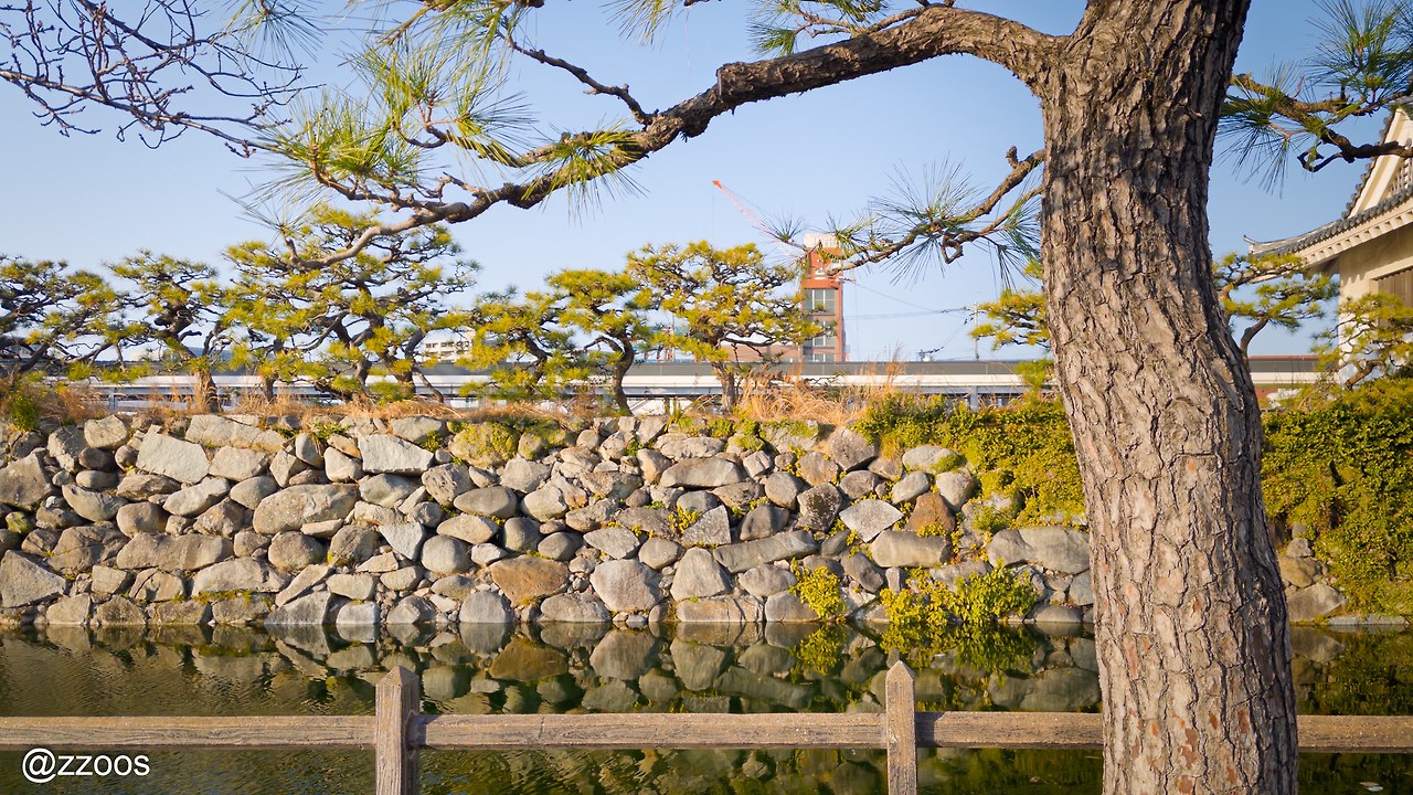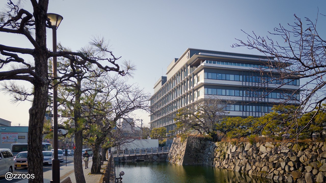 이런 현대의 건물 앞에 마치 일본의 성처럼 해자가 흐르고 있어요. 그 해자 뒤에는 전통적인 느낌을 주는 돌담이 있어서, 시청사를 현대의 성(城)처럼 느끼도록 만든단 말이죠.