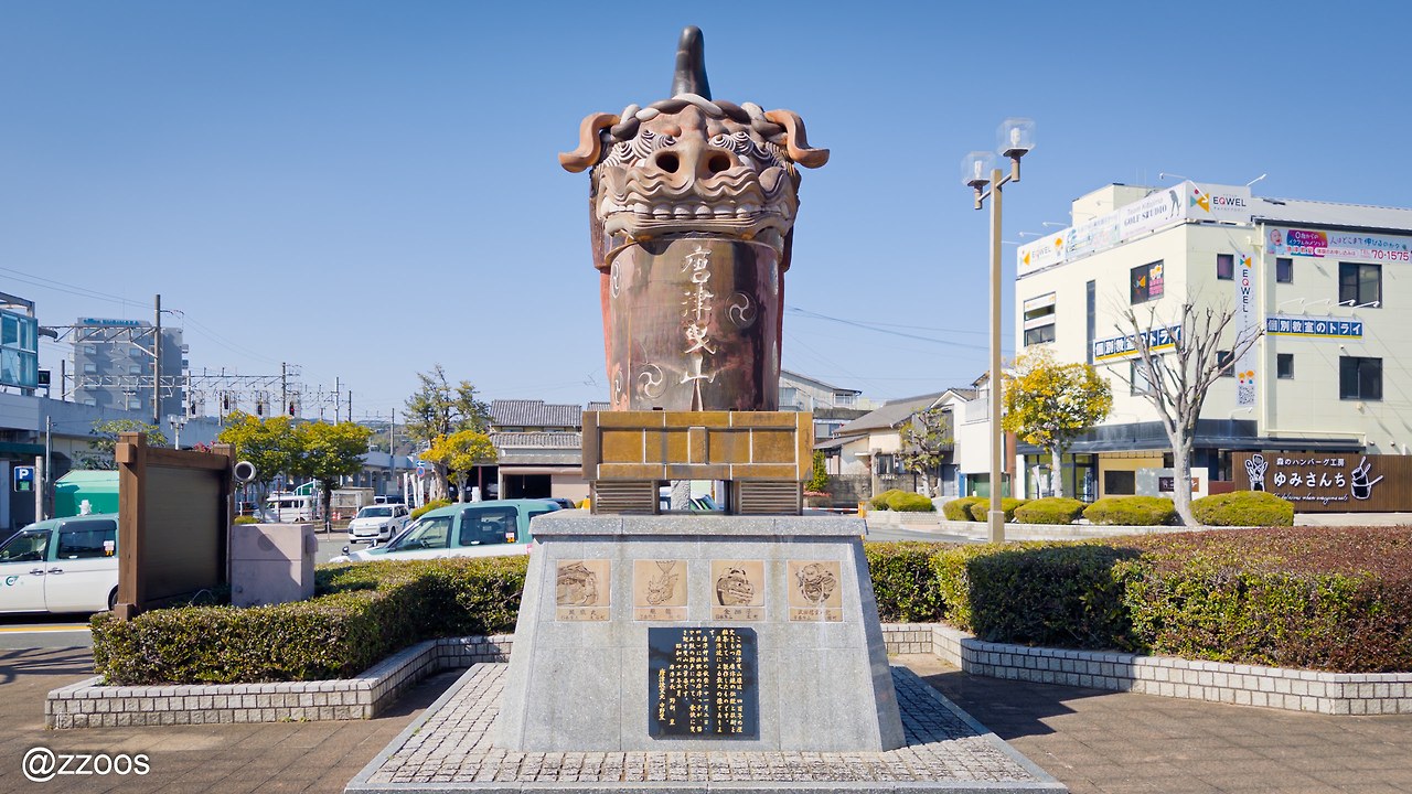 가라쓰 역 앞에 가보면 가장 먼저 눈의 띄는 것은 커다란 사자상입니다. 단일 규모의 가장 큰 가라쓰 야키라고 하는데요.
