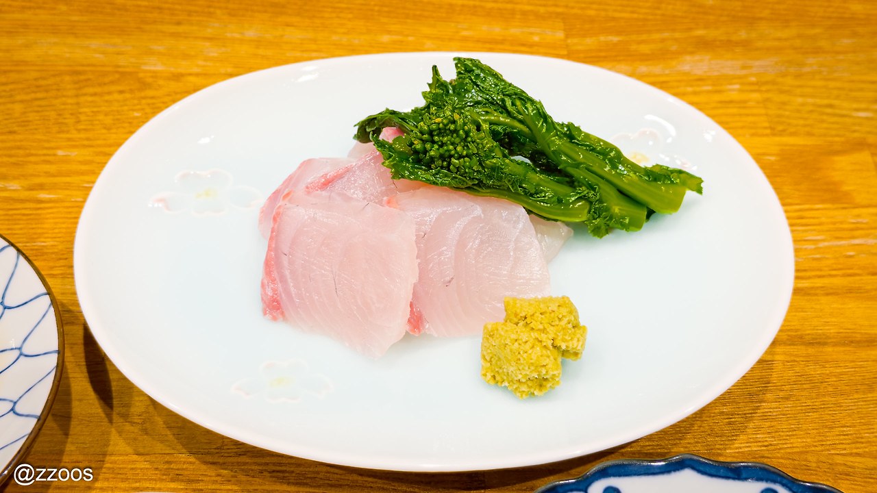 다음으로 나온 것은 칸파치(カンパチ)와 나노하라(菜の花)입니다. 잿방어랑 유채꽃을 간장에 살짝 절인 것이에요. 취향 저격 당하듯이 제가 좋아하는 생선과 야채가 나오네요.