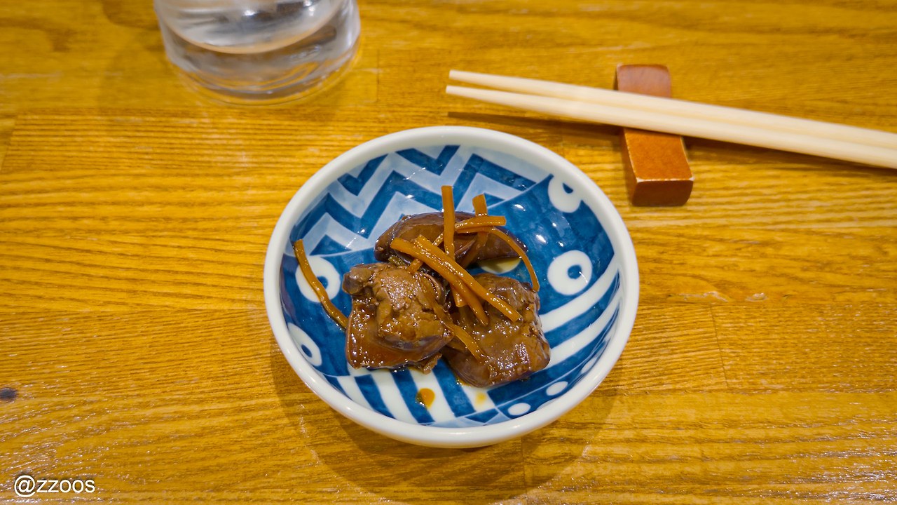 닭의 간을 간장에 조린 거예요. 간 특유의 질감과 향이 있고 간장 덕분에 먹기도 편합니다. 약간은 퍽퍽하다는 느낌도 들지만, 그럴 때 쇼츄를 한 모금 마시면 싹~ 씻겨 내려갑니다.