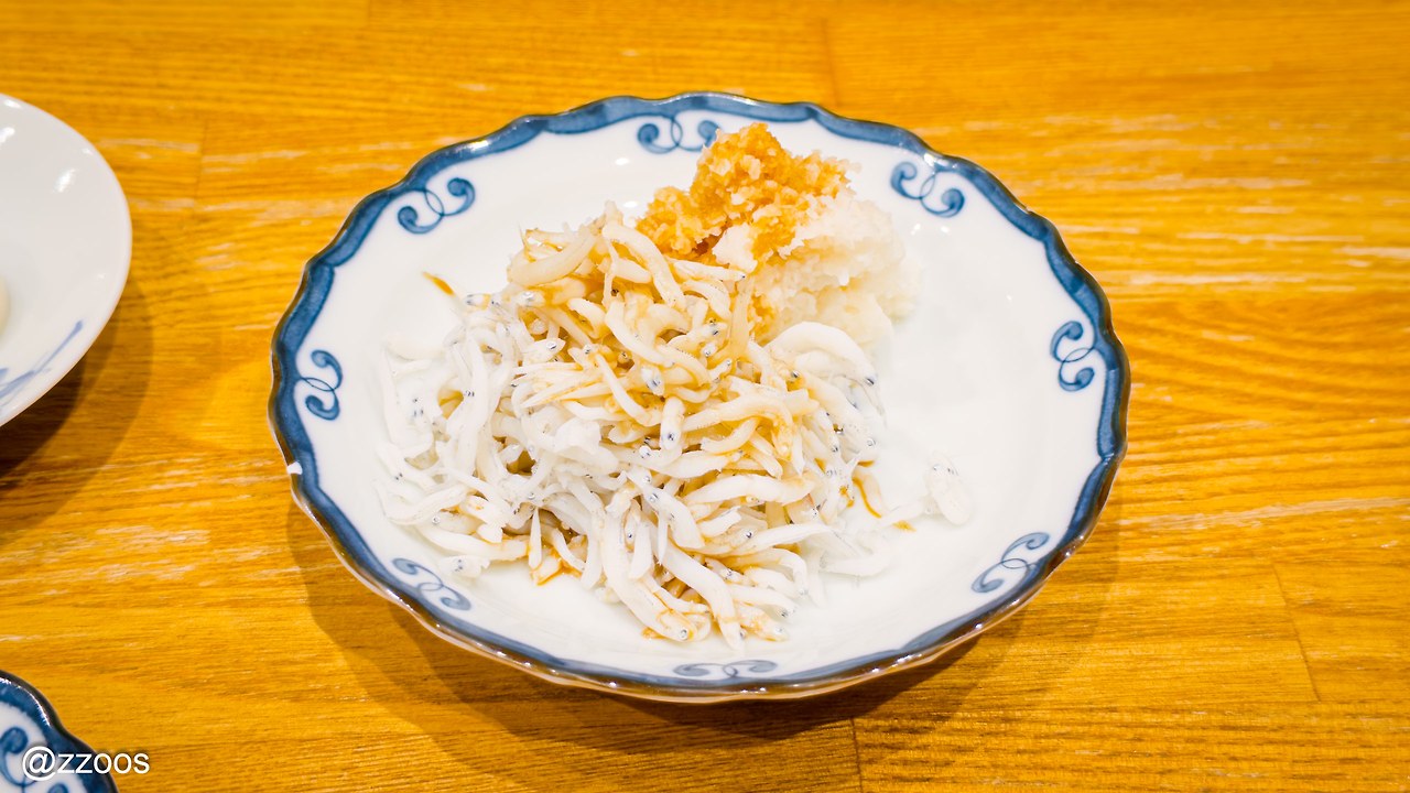 그러시더니 주섬주섬 뭔가를 꺼내서 접시에 담아 주십니다. 나마시라스는 아니지만 시라스를 삶아서 살짝 말린 거네요. 옆에는 매운 무를 갈아 간장을 살짝 뿌려서 함께 올려 주셨습니다.