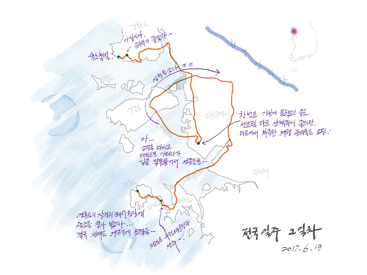 자, 아침을 먹었으니 본격적으로 2일 차의 여행을 출발... 하기 전에! 앞선 포스팅에서 말씀드렸듯이 이번 여행은 '운전 연습'을 위한 여행이었습니다. 그러다 보니 길에서 보낸 시간이 많죠. 운전을 할 때는 사진을 못 찍어서 여행 기간 대비 사진의 수량도 적습니다. 그래서 운전 경로를 위와 같이 그림으로 표시해보면 어떨까 싶더라고요. 그러면 2일 차의 여행이 어떤 경로로 움직였는지 쉽게 알 수 있을 것 같더라고요. 물론 저 스스로도 더 잘 정리될 것 같고요.