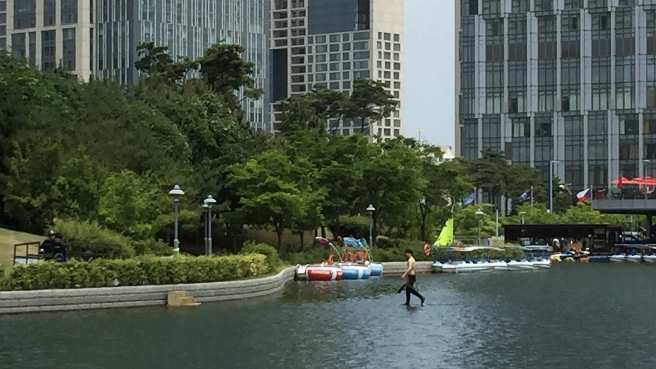 이건 뭐 별 거 아닌데... 산책하다가 물 위로 걸어 다니는 사람이 보여서 깜짝 놀랐습니다. 가까이 가서 보니 공사를 하는 건지 공연 준비를 하는 건지 모르겠는데, 수면에 보일 듯 말 듯 데크를 설치하고 계시더군요. 멀리서 보면 진짜 물 위를 걷는 걸로 보입니다. (멀리서 줌으로 땡겼더니 화질이 엉망이군요. 디지털 줌의 한계...)