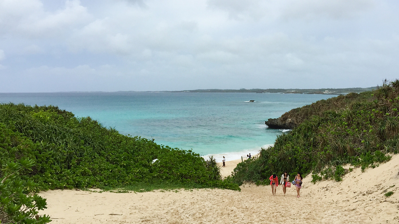 미야코섬으로 넘어와서 아주 유명한 해변으로 가자더니 입구가 영 썰렁하다. 그리고 꽤 높은 모래 언덕을 넘어가야 한다. 사실 거리가 그렇게 긴 것도 아닌데 바닥이 모래이다 보니 몇 배는 더 힘들게 느껴진다. 음... 운동을 별로 안 하는 아저씨에게만 힘든 고개일 수도 있겠다.