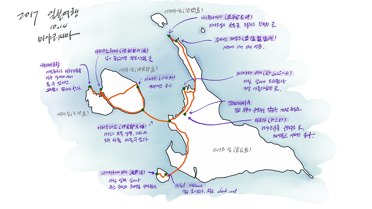 일단은 숙소에서 출발해 이라부 대교(伊良部大橋)의 남단에 차를 세웠다. 오늘의 목적지는 이라부 섬과 시모지 섬. 고베에서 온 형님은 일본인이 자신뿐이라는 사실에 자기가 안내를 해야겠다는 생각이었는지, 아니면 나이가 가장 많아서 안내를 해야겠다는 생각이었는지, 아니면 원래 성향이 그런 사람인지는 잘 모르겠으나 결론적으로 우리를 이끌어 주고 있었다.