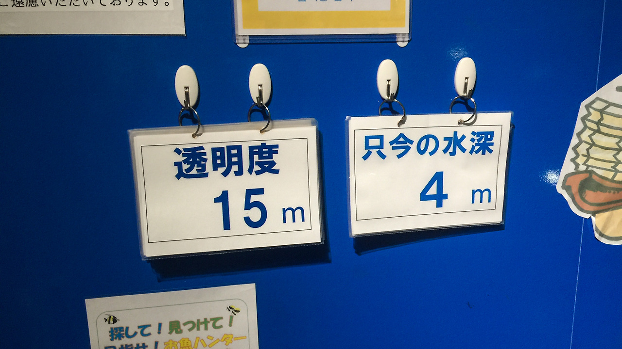 어쨌든 입장권을 사서 건물의 아래로 내려가니 현재 수심과 오늘의 시야를 알려주는 푯말이 보인다. 밖에서 보던 아름다운 바닷속으로 4미터 내려왔다는 거구나. 날은 흐리지만 15미터 정도의 시야라면 뭔가 볼 수도 있겠는데? 하는 기대감도 살짝 들었다.