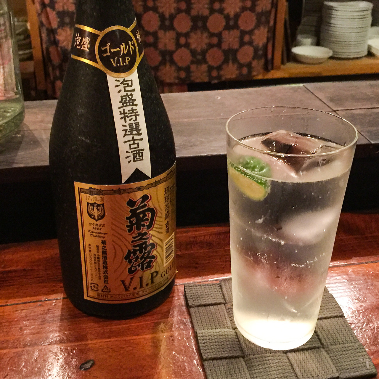 저녁을 배부르게 먹고 왔으니 언제나처럼 첫 잔은 하이볼을 마시고 싶었다. 아무래도 오키나와니까 고쥬(아와모리를 숙성시킨 것)를 이용해서 하이볼을 만들어 달라고 했더니 시쿠와사(오키나와 특산 귤)를 반쪽 넣어준다.
