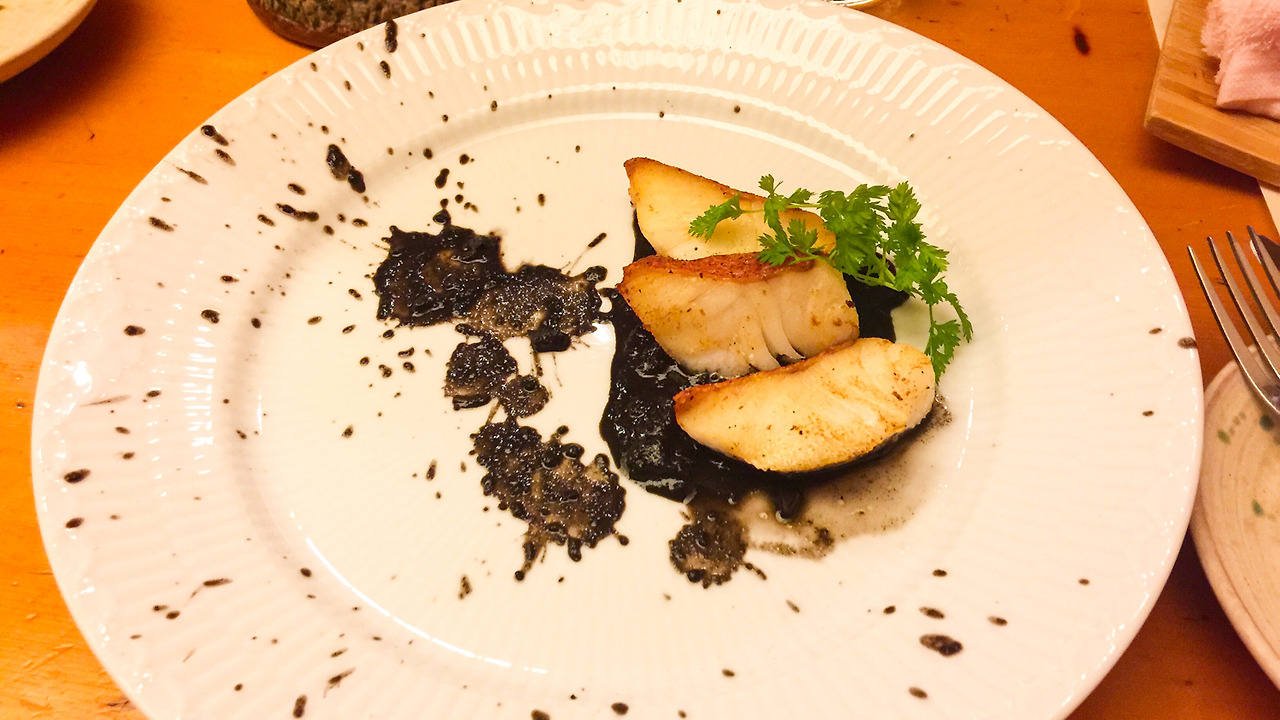 사장님과 이런저런 얘기를 하다 보니 생선 요리도 먹고 싶어 져서 추천을 부탁드렸다. 선뜻 '섬문어 먹물 소스와 무늬바리 스테이크'를 추천해주셨다. 당시에는 생선 이름을 번역하다가 '붉바리'인 줄 알고 엄청 좋아했었는데, 나중에 다시 검색해보니 무늬바리. 어쨌든 친구 어종이라 확실히 맛있었다.