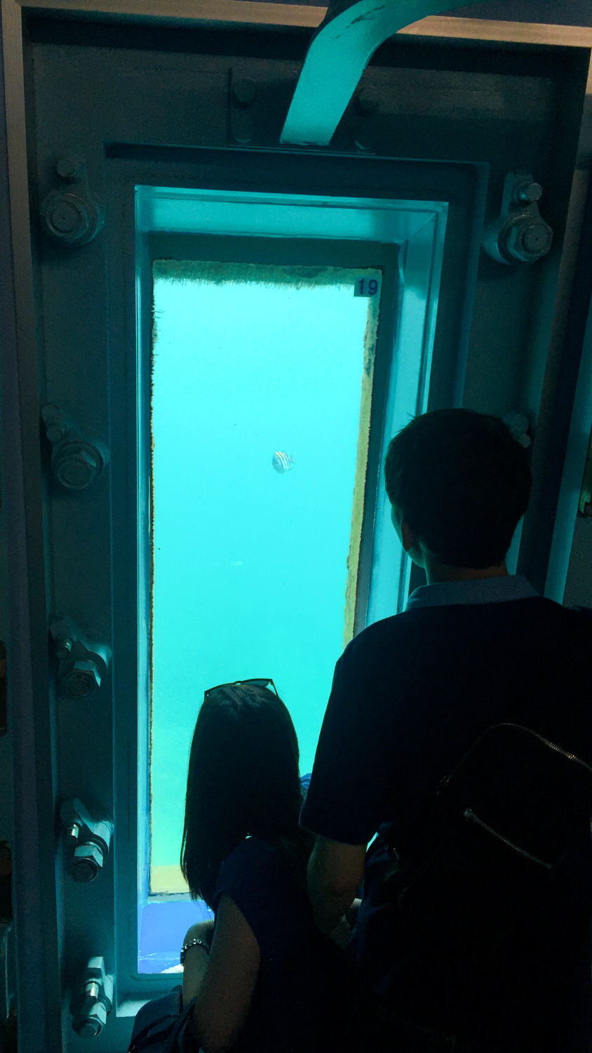 계단을 걸어 내려와서 지하에 도착하니, 어라? 꽤 신비로운 느낌도 든다. 비수기인데도 불구하고 사람들도 많은 편. 물이 탁한 건지 유리가 더러운 건지 모르겠지만 아주 맑고 투명하게 바다가 보이지는 않았다.
