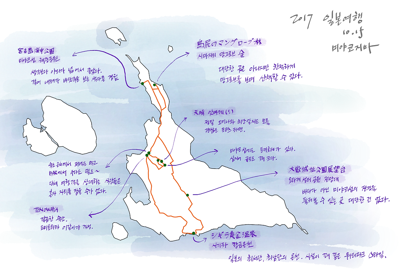 있다! 있어! 미야코 섬의 남쪽에 '온천'이 있다. 심지어 그 온천은 일본 최남단의 온천이라고 한다. 또한 일본 최서단의 온천이라고. 그러니까 일본에서 가장 서쪽이자 가장 남쪽에 있는 온천. 구글맵으로 경로를 찍어보니 약 40분 정도 걸리는 거리다. 온천을 하고 나면 축 늘어져서 반주와 함께 저녁을 먹어야 할 것 같아서, 시간을 좀 더 때울 겸 남쪽으로 내려가는 중간에 한 군데 더 들러보기로 했다.