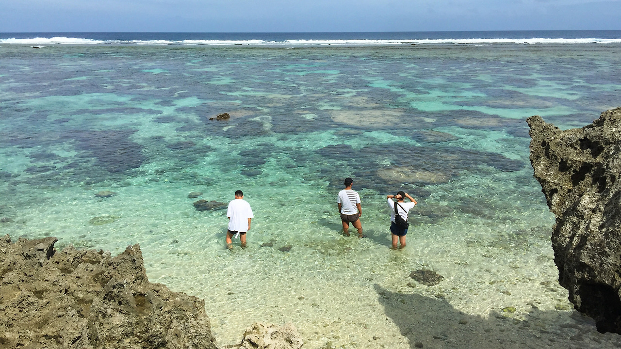 겨우 사람이 들고 난 흔적이 보이는 수풀 속의 작은 길을 따라 내려가면 시멘트로 만든 계단이 나타나고, 그 계단 아래에는 맑고 깨끗한 바다가 보인다. 파도도 저 멀리에서 부서지기 때문에 잔잔한 곳. 얇고 맑은 바다 안에 특이한 모양의 바닥이 드러나 있는 걸 보니 스노클링 하기에도 좋아 보이는 곳이었다.