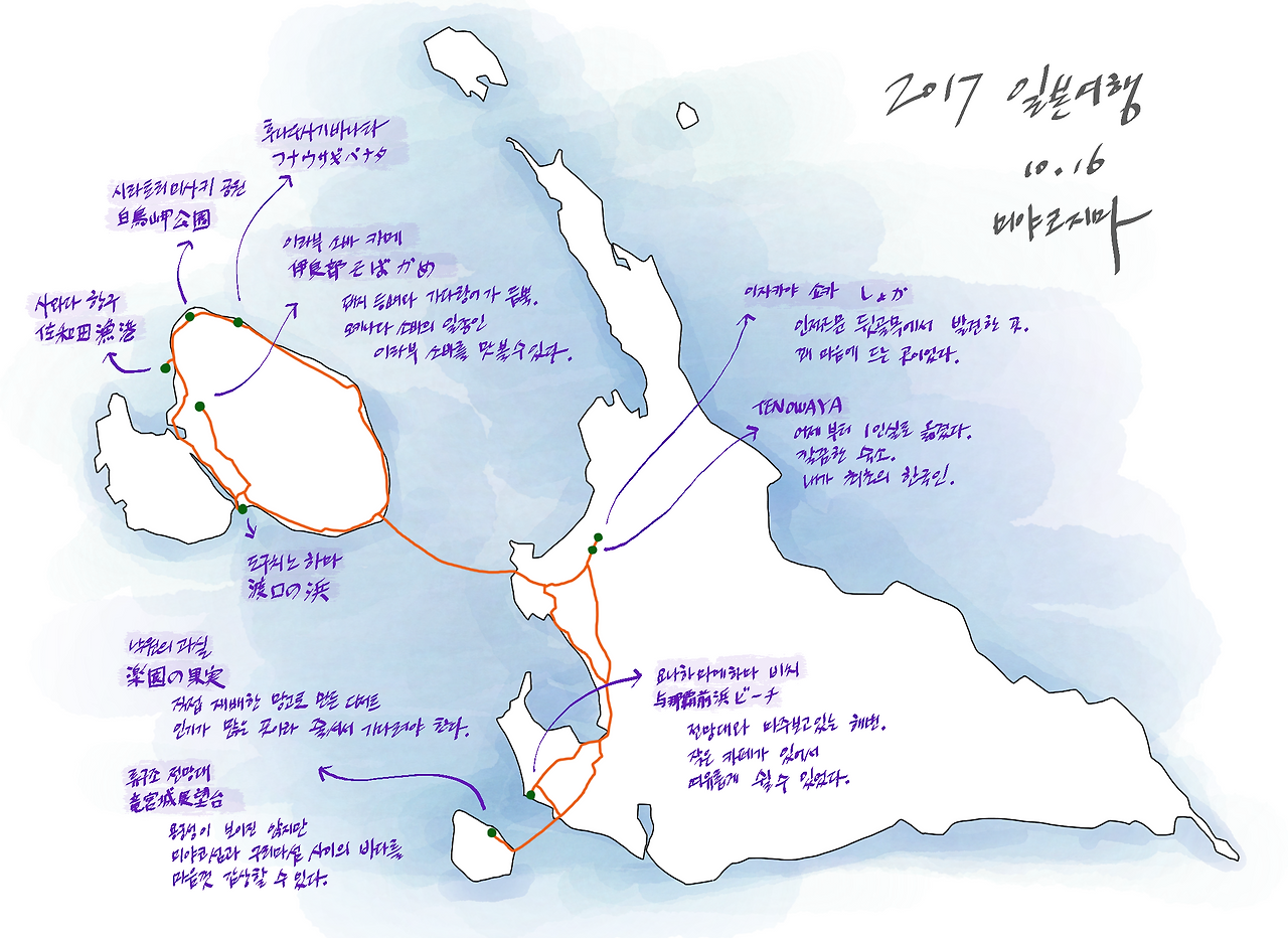 그래, 오늘은 바다를 실컷 보자. 며칠 전에 히비스커스 호텔에서 만났던 사람들과 함께 돌아다닌 이라부섬을 한 바퀴 돌아보는 건 어떨까? 당시는 고베에서 온 형님을 따라다니느라 내 마음대로 돌아다니지 못했으니까.