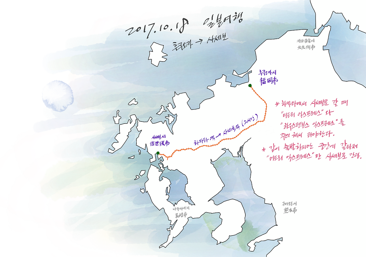 하카타에서 출발해 사세보까지 달리는 '미도리 익스프레스'에 앉아서 어젯밤 정리한 내일과 모레의 일정을 다시 한번 체크해봤다.