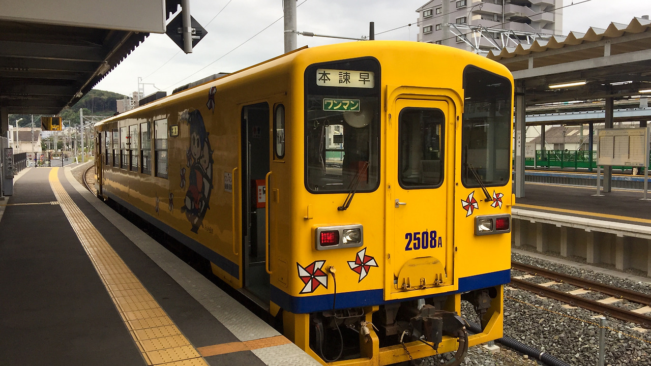 플랫폼에서 안내문을 보면서 열차를 기다리고 있다 보니... 샛노란색의 작고 귀여운 열차가 들어온다. 이것이 바로 시마바라선이구나.