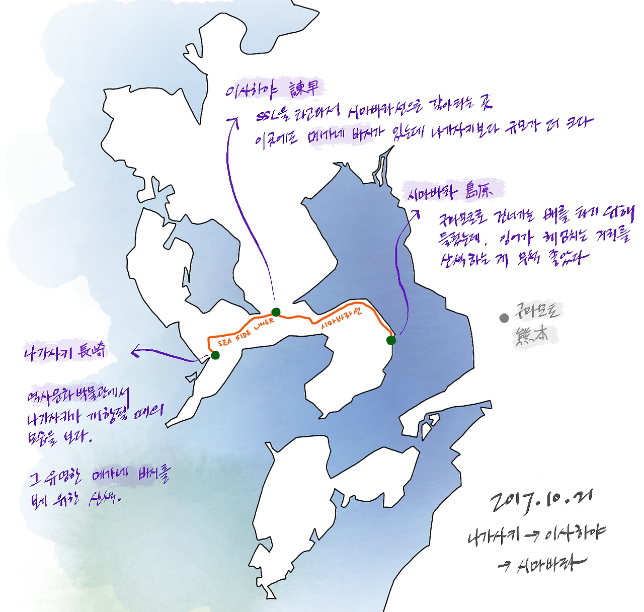 안경다리 두 개를 비교할 수 있도록 사진을 충분히 찍은 다음 단체 관광객을 피해 다시 이사하야 역(諫早駅)으로 돌아왔다. 헌데, 지금 지도를 들여다보니 안경다리를 구경한 다음에는 혼이사하야 역(本諫早駅)으로 가는 것이 더 가까운 코스였겠구나...