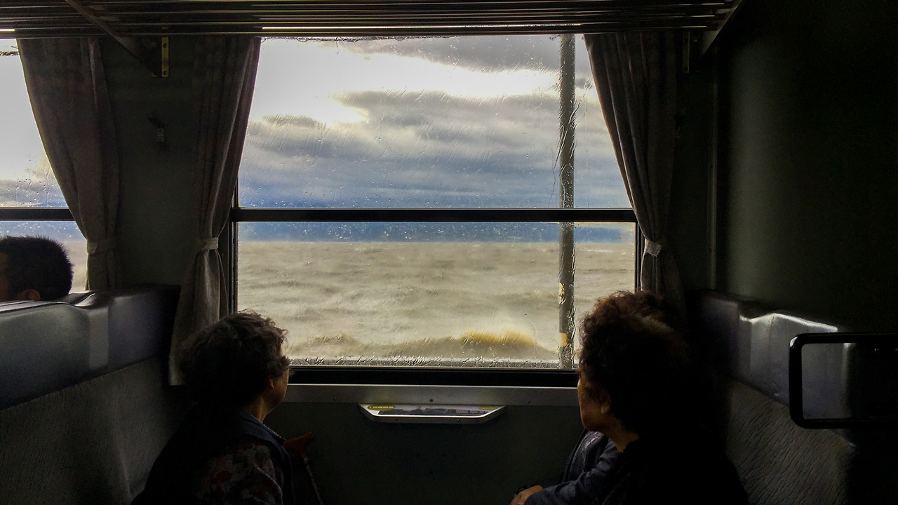 의외로 바람이 세지 않고 하늘도 조용하다고 생각했는데, 열차가 출발한 다음 금방 하늘이 흐려지고 비가 내리기 시작하더니 금세 빗방울이 굵어졌다. 창밖으로 보이는 아리아케 해(有明海)의 모습이 보이기 시작할 때에는 모든 배의 결항을 이해할 수 있었다. 아니 오히려 지금 내가 타고 있는 열차는 괜찮은 걸까? 이 열차도 운행 중지했어야 하는 건 아닐까? 싶을 정도로 높은 파도가 둑을 넘어 열차의 창문까지 와서 닿고 있었다.