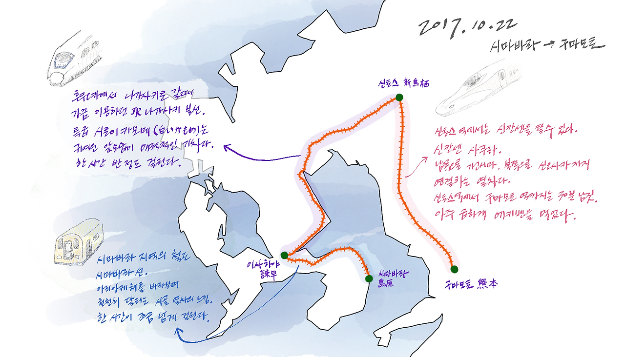 [미나미시마바라(南島原) 역 → 이사하야(諫早) 역] 구간은 시마바라의 지역 철도인 시마바라선을 탄다. 이사하야에서 JR 나가사키 본선으로 갈아타고 [이사하야(諫早) 역 → 신토스(新鳥栖) 역] 구간을 이동. 이때 이용하는 열차는 전에도 탔던 적이 있는 시로이 카모메(白いかもめ). 하얀 갈매기라는 뜻으로 꽤 귀엽게 생긴 특급 열차다. 신토스 역은 신칸센이 지나는 역이다. 큐슈의 저 아래인 가고시마부터 위쪽으로는 신오사카까지 연결하는 신칸센 사쿠라(さくら)를 이용해 [신토스(新鳥栖) 역 → 구마모토(熊本) 역] 구간을 이동하면, 기차를 두 번 갈아타고 총 세 종류의 기차를 이용해서 구마모토에 도착할 수 있다.