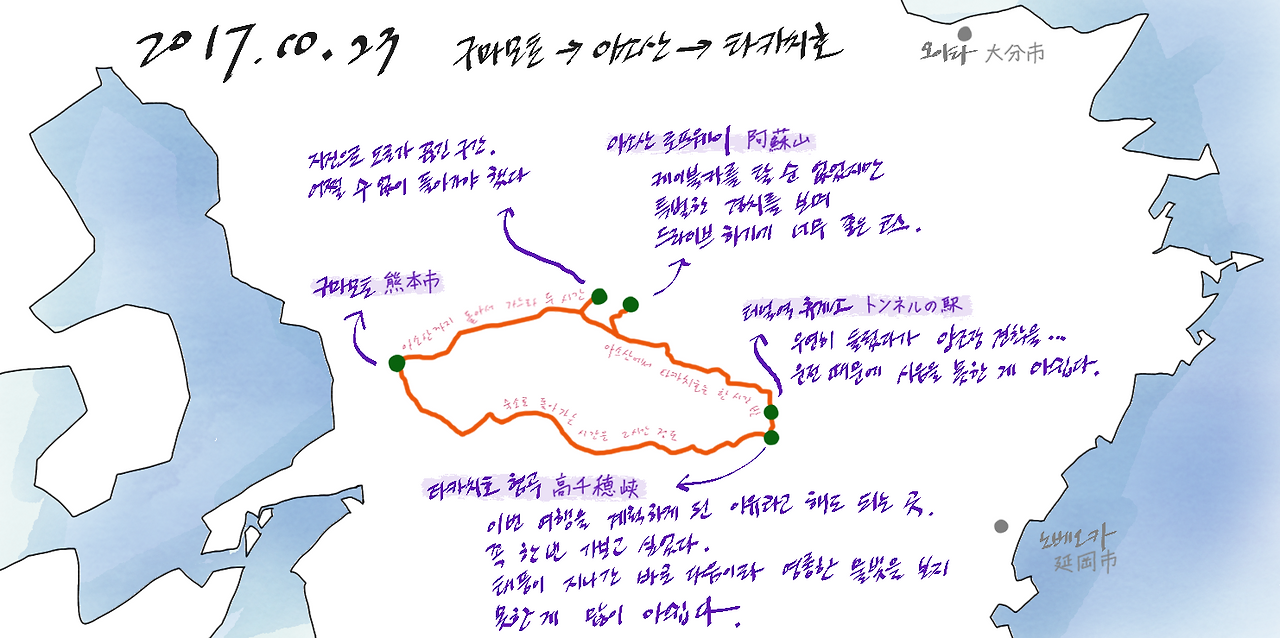산책은 그리 길지 않았는데 어느덧 오후 다섯 시가 가까운 시간이다. 돌아가는 데 두 시간이 걸릴 테니 이제 슬슬 구마모토로 돌아가서 렌터카를 반납해야 할 시간이다. 해가 지고 나면 어두워질 것이라는, 당연한 일도 문제였다. 야간 운전 경험이 그리 많지는 않은 데다가 익숙하지 않은 해외에서의 운전이니까.