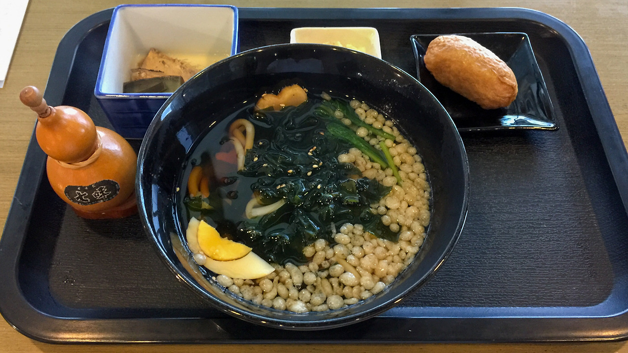 렌터카를 찾고 숙소에 체크인하기 전에 일단 몸을 데우고 속을 풀어야 했다. 가방을 메고, 우산을 쓰고 항구 밖으로 나서다 보니 바로 건물이 하나 보이는데 카페 비슷한 것이 보인다. 일단 가까이 가서 메뉴판을 보니 식사가 가능한 곳이다. 더 생각할 것 없이 자리를 잡고 앉아서 우동을 한 그릇 주문했다. 특별한 맛은 아니었지만 해초가 들어가서 감칠맛이 풍부했고, 따뜻한 국물이 몸을 데워주고 속을 풀어주니,