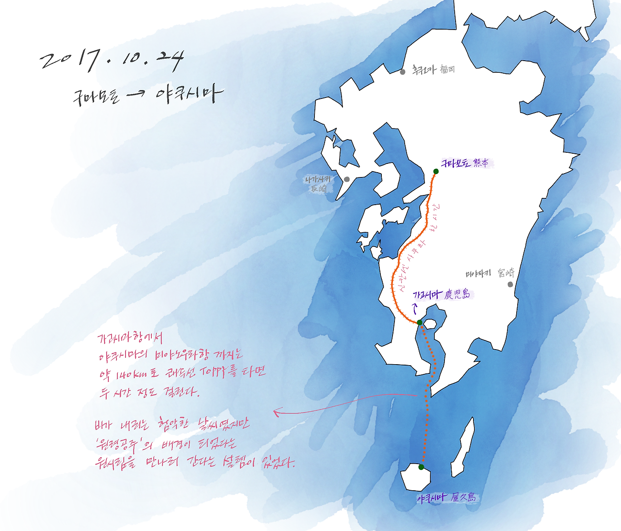 140Km 면 완도 ~ 제주의 거리보다 살짝 먼 거리이고 목포 ~ 제주보다는 가까운 정도의 거리다. 막상 야쿠시마를 다녀올 때에는 얼마나 먼 곳인지 깨닫지 못했는데, 우리나라와 비교해서 생각해보니 엄청 먼 곳을 다녀왔다는 것을 실감했다.