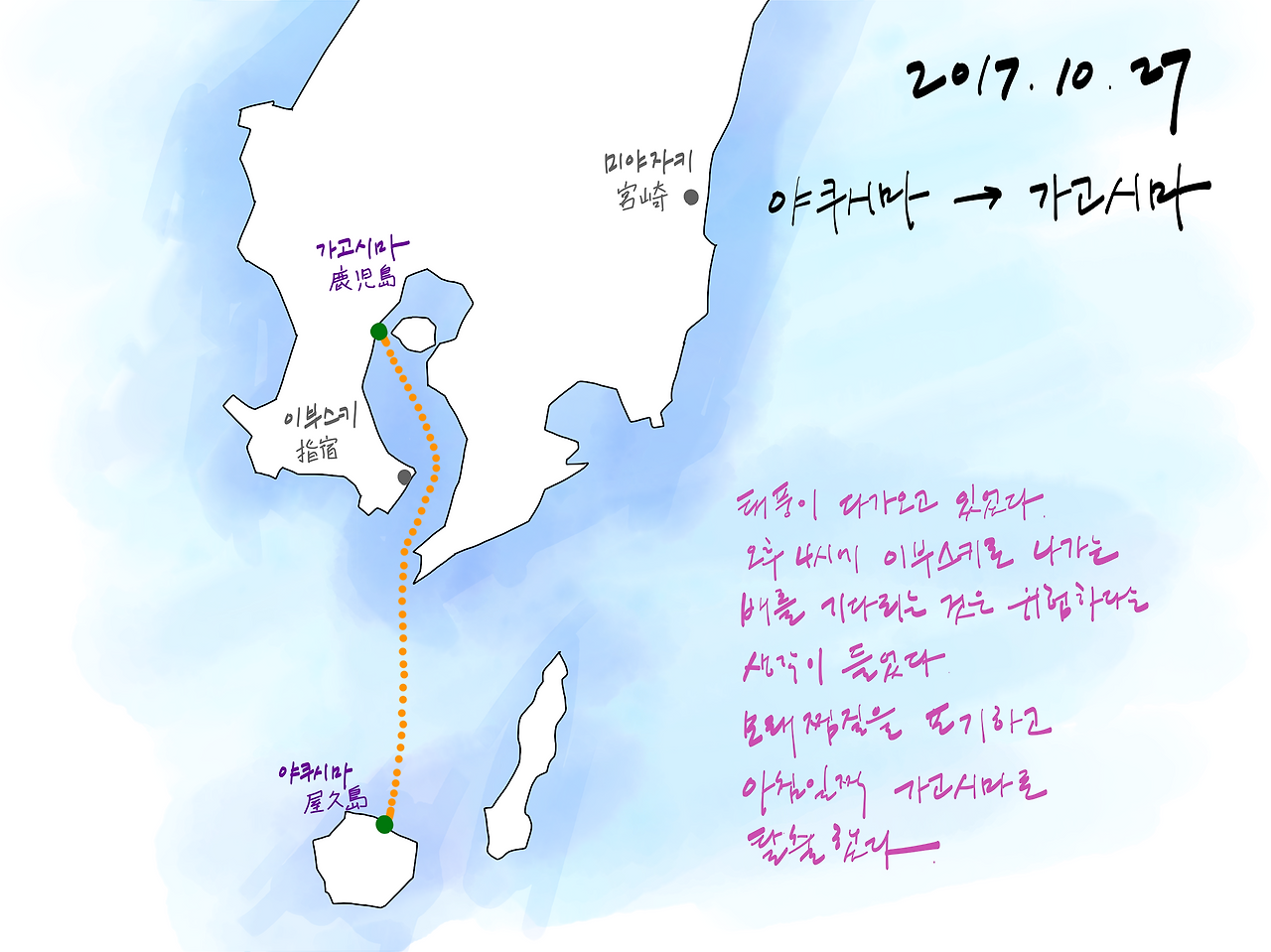 짐을 챙겨 숙소에서 체크아웃한 다음 상황을 살펴보기 위해 일단 미야노우라항(宮之浦港)으로. 눈으로 직접 확인한 바다 상황은 별로 좋지 않았다. 비까지 내리고 있는 상황. 정말 태풍이 다가오고 있다는 것이 느껴졌다. 아무래도 최대한 빠르게 섬을 빠져나가는 것이 좋겠다는 생각이 들었고, 매표소에 가서 배 시간과 운항 상황을 확인해보니 약 한 시간 뒤에 가고시마로 나가는 배가 있어서 예약을 변경했다.