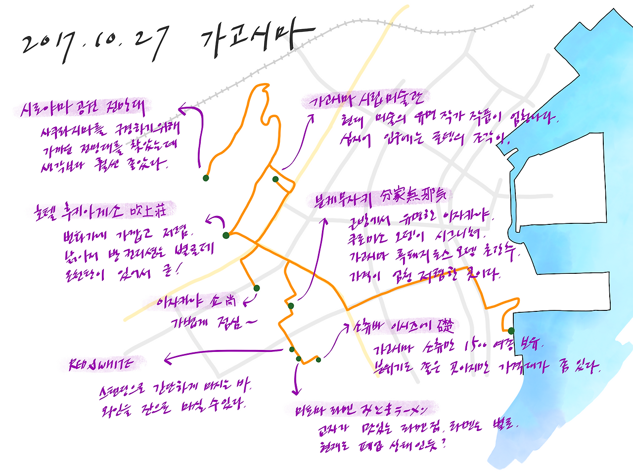 배에서 내려 예약해둔 숙소까지 지도를 보니 도보로 약 20분 정도 걸리는 거리. 어차피 점심을 먹어야 하니 가고시마 시내 구경을 하면서 걸어가기로 했다. 분명히 태풍의 영향권에 들어가면 비가 오기 시작할 테니 맑은 하늘의 가고시마를 보는 건 지금이 마지막일 테니까.