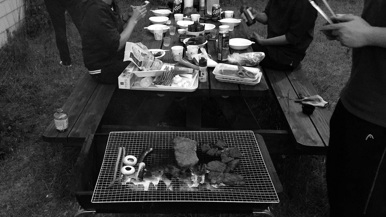 굽고, 굽고, 굽고, 먹고, 먹고, 먹고, 마시고, 마시고, 마시고, ... 다섯 명 모두가 흡연자인 아름다운 모임.