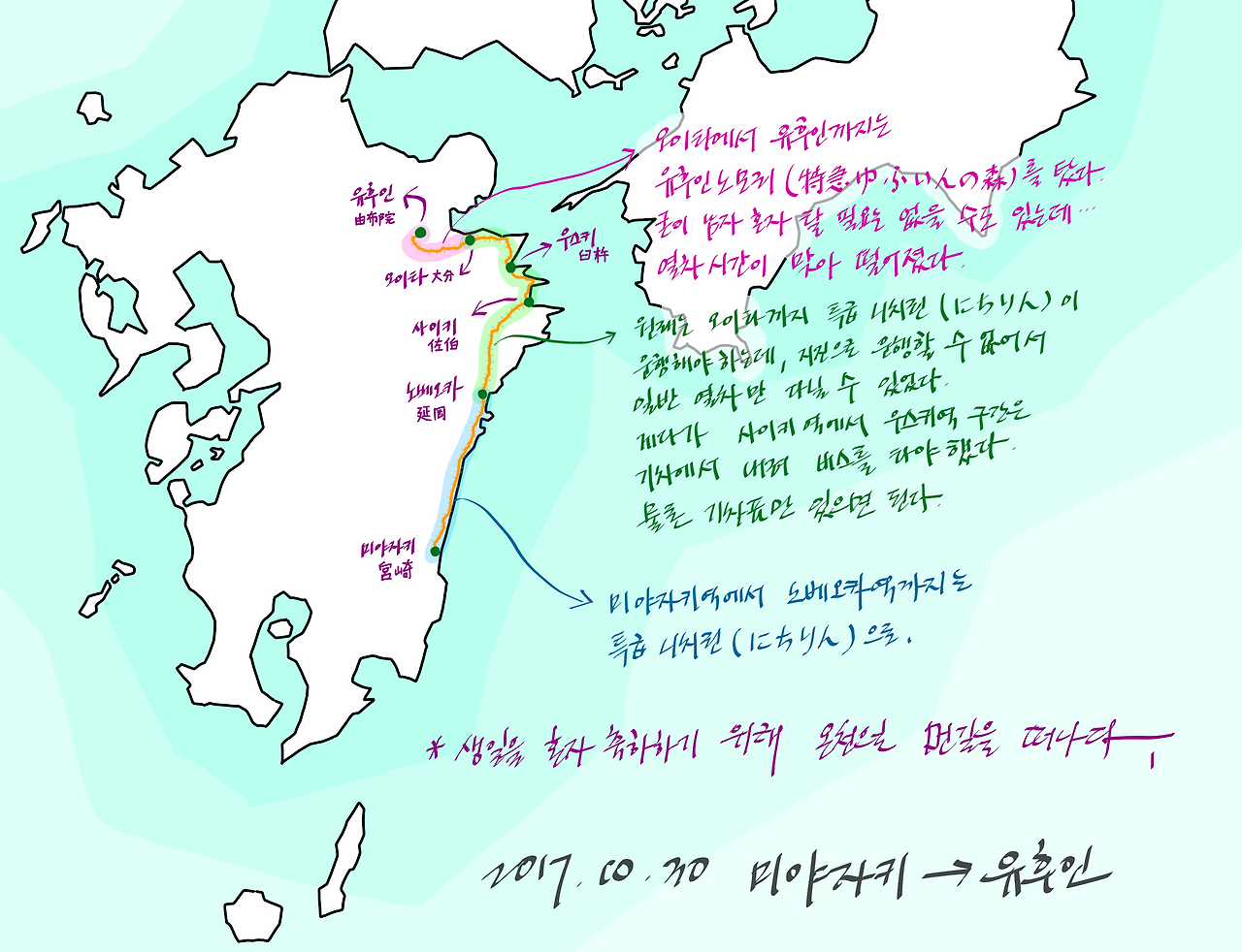 아홉 시 반에 미야자키역(宮崎駅)에서 출발하는 기차를 탔다. 특급 니치린(にちりん). 원래는 이 열차만 타도 오이타역(大分駅)까지 갈 수 있는데, 아직 지진의 여파가 남아 있는 건지 특급 열차가 운행할 수 없는 구간이 있다고 한다. 그래서 오늘의 코스는 더욱 복잡해질 예정이다. 심지어 일반 열차도 아예 운행할 수 없는 구간이 있어서 버스를 타야 하는 구간도 있다.