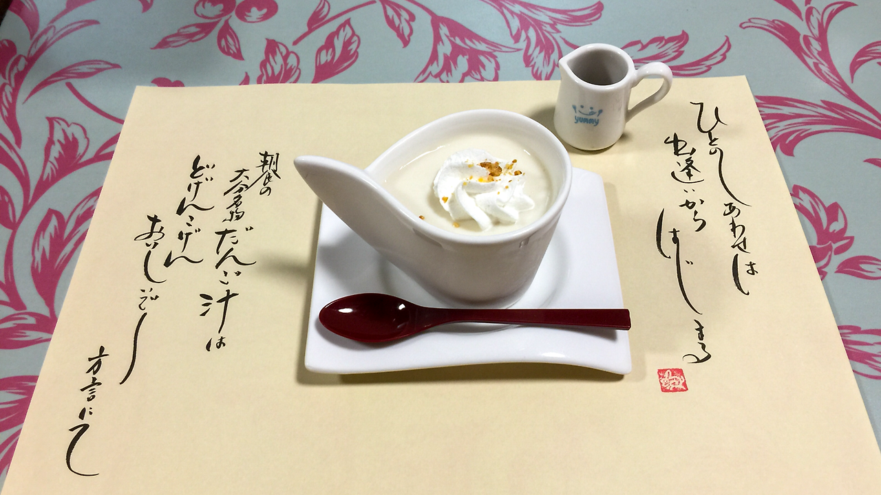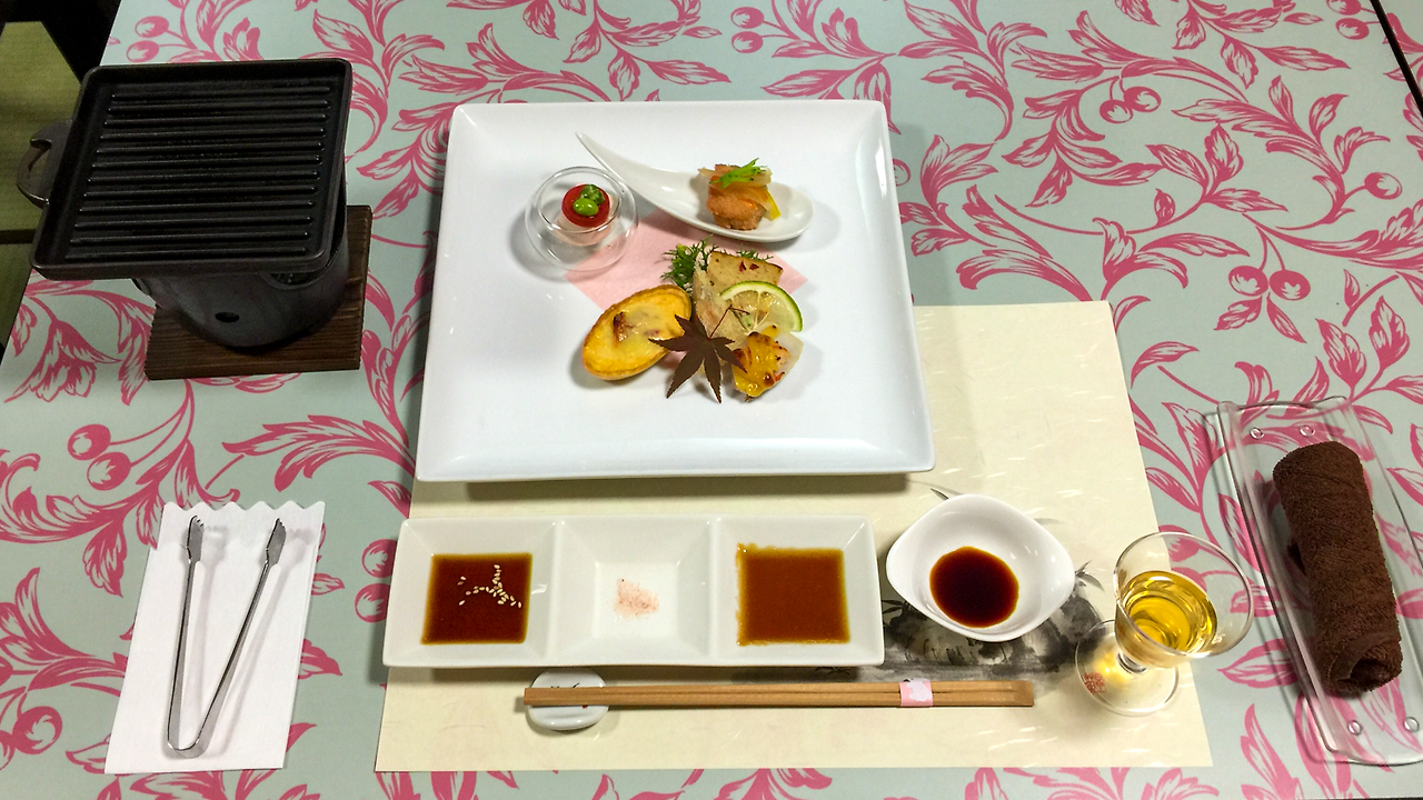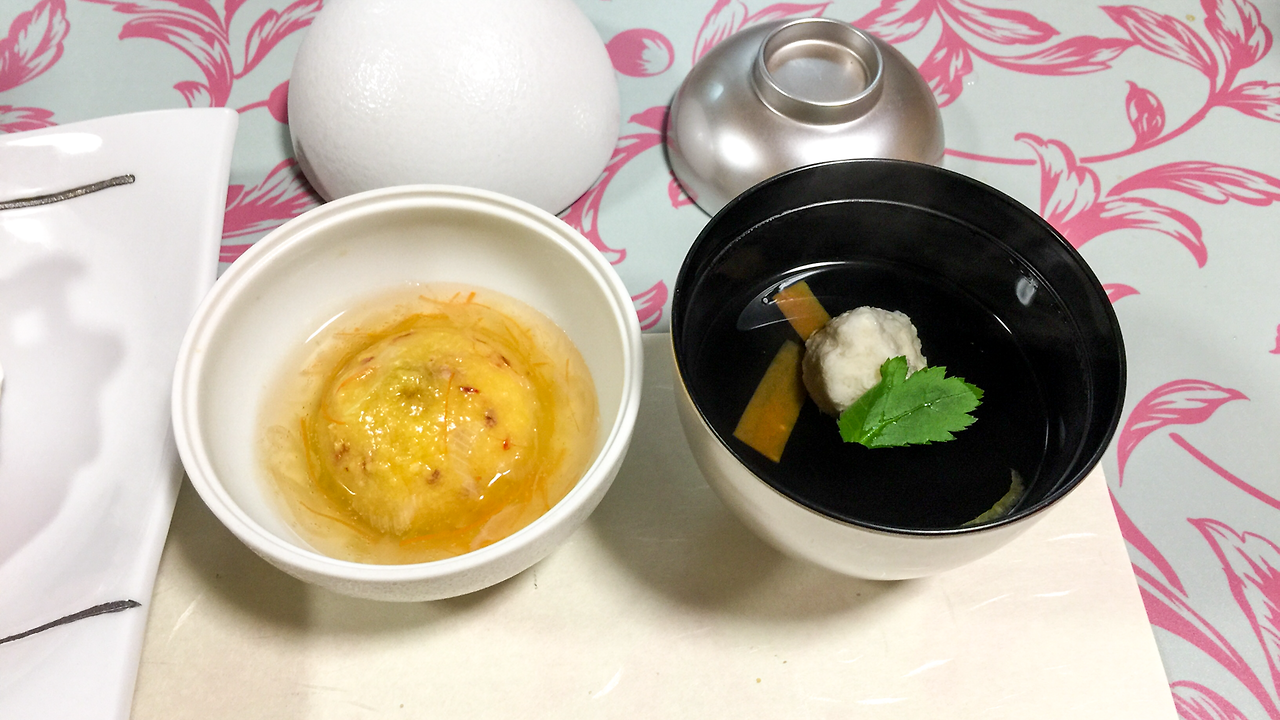 어쨌든 기억과 당시에 남겨둔 메모를 기반으로 설명해보자면, 오른쪽의 맑은 탕 안에는 유바(두부를 만들 때 위에 뜨는 것)를 섞어 만든 어묵이 들어 있었고, 왼쪽의 걸쭉한 녀석은 호박으로 만든 요리였다. 호박의 향과 맛이 나다가 그 아래에는 쫀득한 모찌 같은 것이 느껴지고, 그 안에 대파의 흰 부분으로 소를 만들어 넣어 달지 않은 특이한 맛이었다.