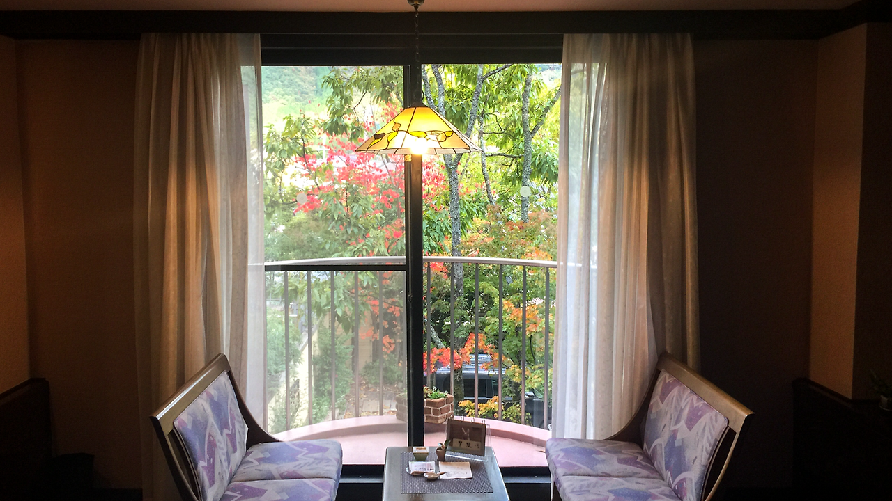 유후인 번화가 바로 옆 골목에 위치한 료칸인 하나무라(はな村)는 괜찮아 보이는 석식을 포함할 수 있었고, 1인 예약도 받아주는 곳이었다. 의외로 1인 예약을 받아주지 않는 료칸들이 많다는 걸 이번에 검색하면서 알게 됐다. 숙소에 도착해보니 작지 않은 사이즈의 침대, 아마도 슈퍼 싱글이나 퀸사이즈 정도로 보이는 침대가 두 개 있고 티테이블도 제대로 갖춰진 큰 규모의 방이었다. 창밖으로는 울긋불긋한 단풍이 보였다. 욕실도 제대로 갖춰진 방이었지만, 계속 온천탕을 사용했기 때문에 욕실은 제대로 쓰지 않았다.
