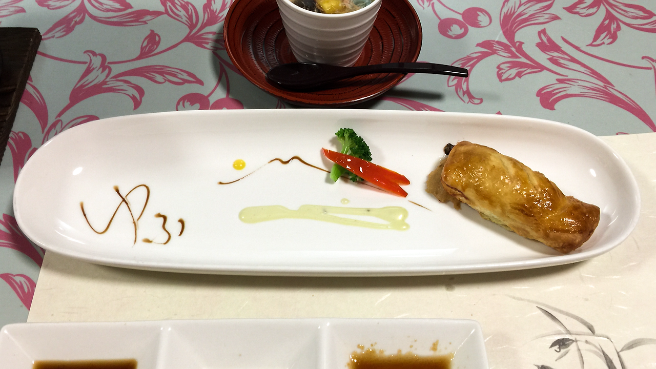 다음 나온 것은 좀 특이한 메뉴였다. 도미와 광어를 이용한 파이. 유후다케와 킨린코를 표현한 것 같은 플레이팅이 솔직히 말해서 좀 촌스러웠다. 파이 안에는 생선 살을 다진 것과 야채가 함께 들어있었는데, 이름은 '파이'지만 오히려 중국 요리에 가까운 느낌이었다.