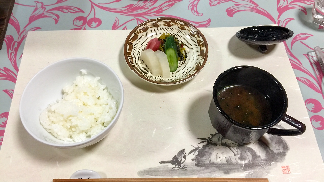 너무 짜지 않은 쯔께모노가 마음에 들었고, 아주 진한 냄새가 나는 된장은 특별해 보였지만 살짝 거부감이 느껴졌다. 일본에서는 국을 먹을 때 그릇을 들고 마시는데, 그릇에 손잡이가 달려있으니 먹기는 편했다. 하지만 뭐랄까... 국그릇에 손잡이가? 라는 생각이 드는 것은 어쩔 수 없는...