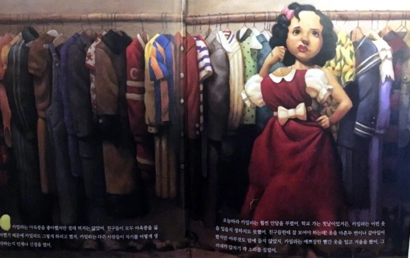 내일은 카밀라가 처음으로 학교를 가는 날이다. 처음 만날 아이들이 보기에 어떤 옷이 가장 좋을지 고르고 고르고 또 고르고... 평생 골라도 선택을 못 할 것 같은 기세로 옷을 보고 또 본다.