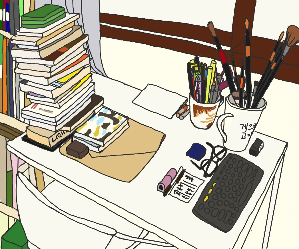 책상 위에는 선물 받은 머그잔과 거기에 꽂혀있는 연필, 수채화용 붓, 드로잉용 펜, 읽다 만 책 대여섯 권, 아이패드와 연동해서 쓰려고 산 무선 키보드, 방금 주머니에서 꺼낸 체크카드, 영수증 두어 장, 자꾸만 트는 입술에 바를 립밤과 아파 보이지 않기 위해 얼마 전에 구입한 레드립스틱 같은 것들이 놓여있었다.