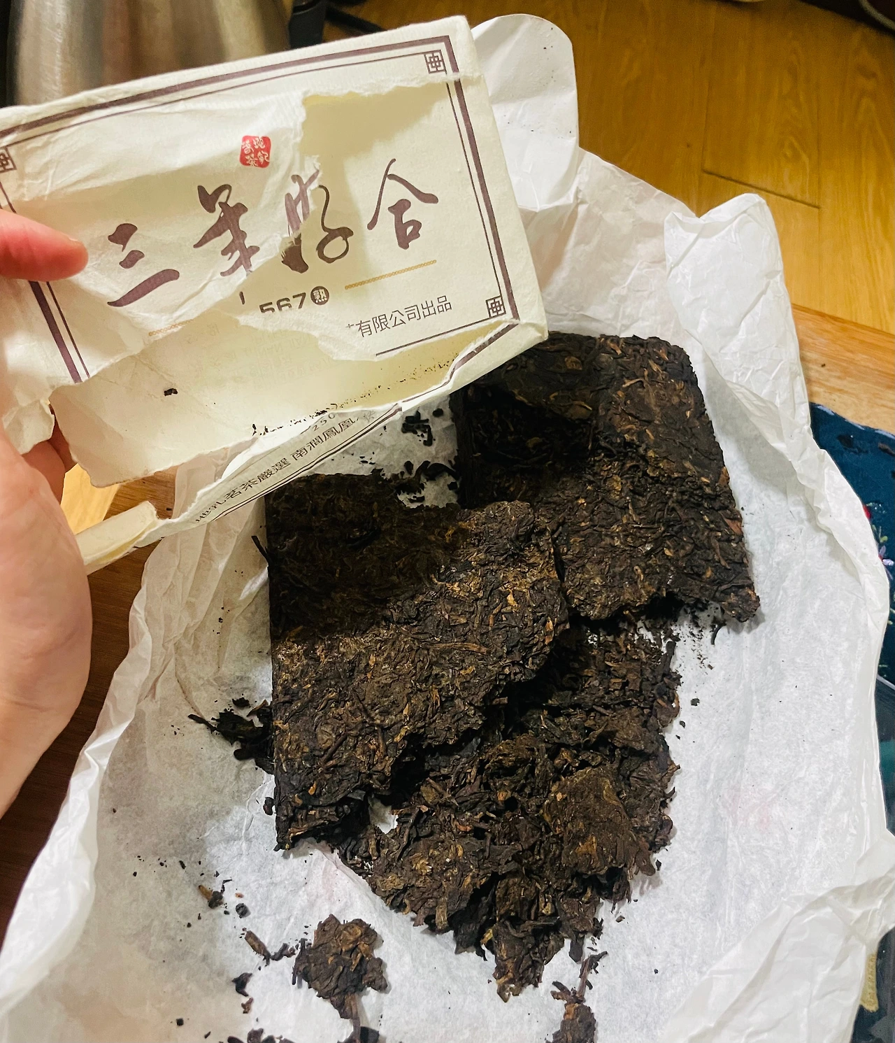 차나무에서 찻잎을 하나하나 따고 덖고 비벼서 벽돌모양으로 압축하여 오랜 시간 익혀서, 벽돌처럼 딱딱해진 보이차.