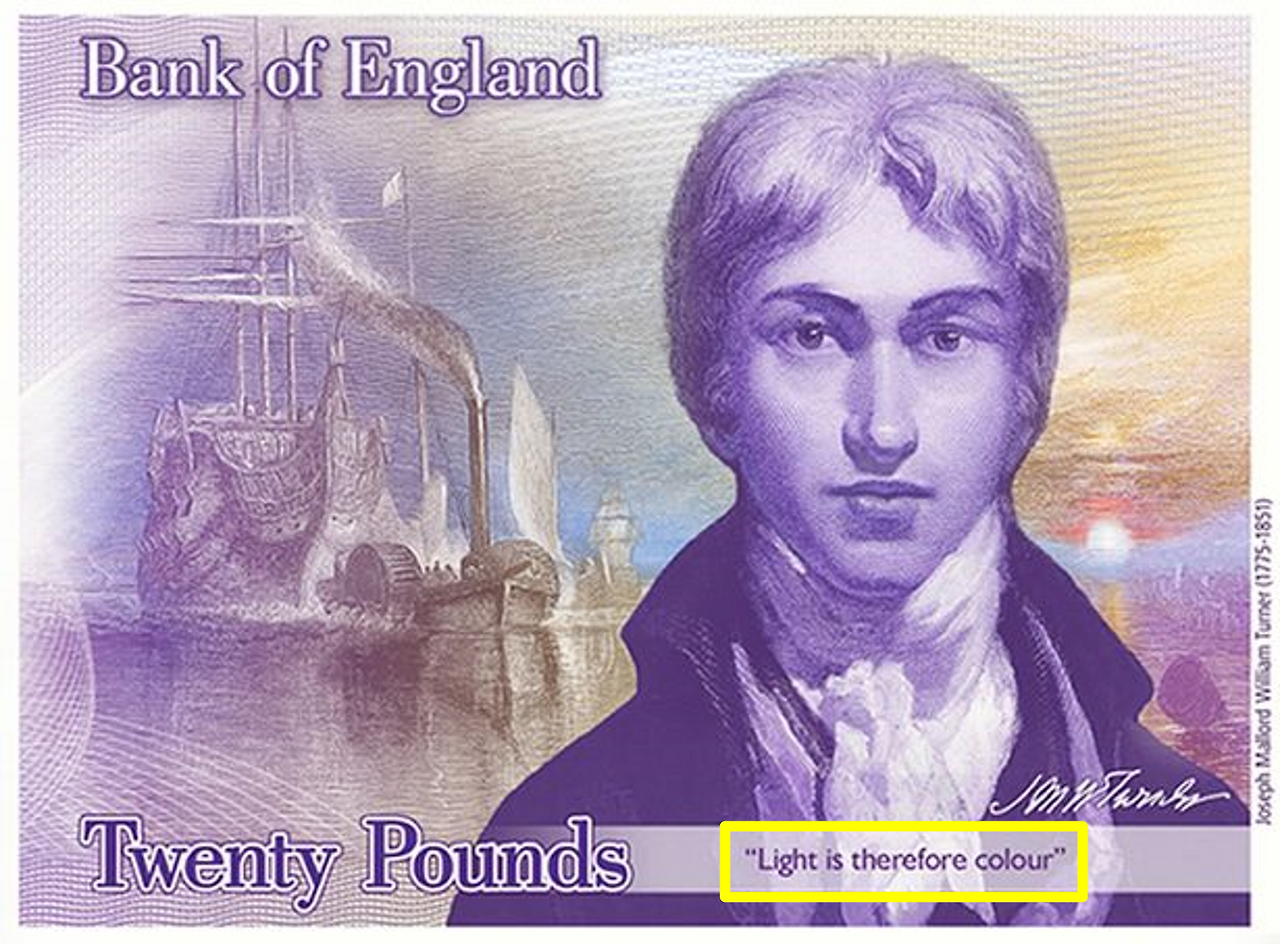 영국에서는 2020년부터 새롭게 지폐의 도안을 바꿨는데요, 이례적으로 국민들의 의견을 받아 지폐에 들어갈 인물들을 선정하였습니다. 영국 중앙은행 관계자는 "이번에 20파운드에 들어갈 인물을 고르기 위해, 수 만 명의 일반인들로부터 590명의 예술가들을 추천받았으며, 이중 JMW 터너를 최종 선택하게 됐다"라고 이야기했습니다.