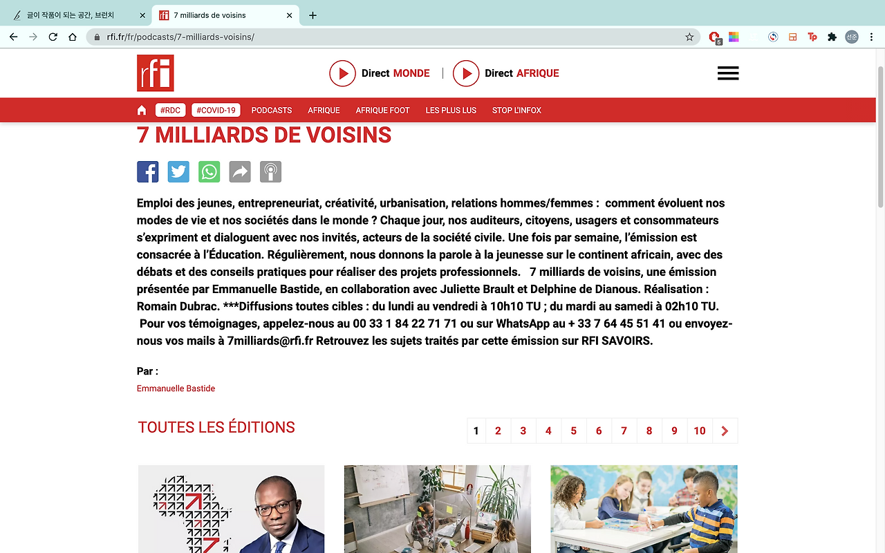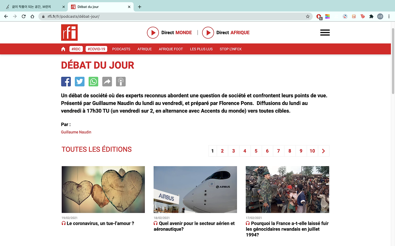 달프를 준비하면서 사회 관련 팟캐스트로 7 Milliards de Voisins와 Débat du Jour을 들어봤고, 둘 다 RFI에서 기획한 팟캐스트다. 둘 다 우리가 살고 있는 사회를 다룬 팟캐스트고 기획한 언론사도 같지만, 각 시리즈 별로 성격이 매우 다르다. 우선 7 milliards de voisins는 사회의 다양한 측면을 소개해 주는 것 위주로 구성되어 있고, 한 에피소드 당 길이가 50분가량으로 다소 긴 편이다. 반면 Débat du jour는 각 에피소드마다 같은 주제를 가지고 서로 다른 견해를 가진 전문가들이 토론, 토의를 하면서 내용이 진행되며, 한 에피소드 당 길이가 30분 정도 된다.