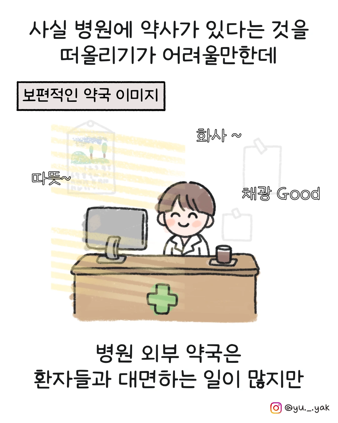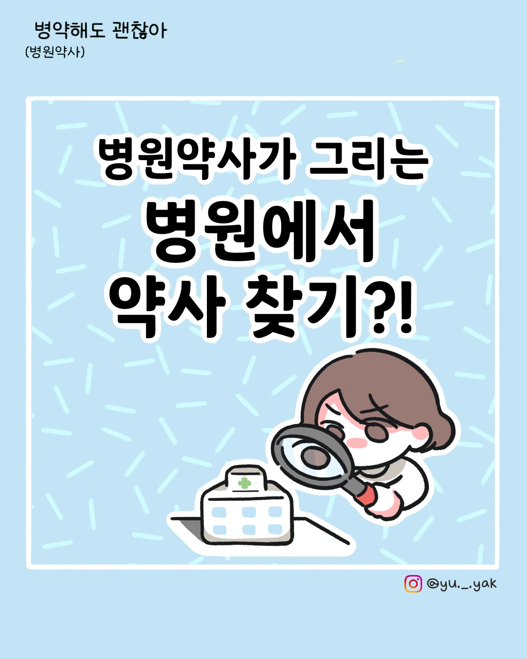 병원약사로 근무하고 있는 유약입니다. 병원약사 일상을 공유하려고 합니다. 인스타그램 [병약해도 괜찮아] 연재중 @yu._.yak