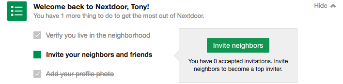 Nextdoor는 간단한 태스크 리스트를 보여주는 방식의 화면 구성을 채택하고 있다. 우선 1) 이미 등록 절차를 마쳤다는 것을 알려주고, 2) 친구나 가족들을 초대할 수 있는 링크를 제공한다. 물론 아직 앱의 메인 화면을 진입하기도 전에 친구초대 링크를 보여주는 것 과연 맞는 것인가에 대한 의문을 제시할 수 도 있겠으나, 디자이너의 의도는 확실히 알 수 있다. "홍보할 수 있도록 한 번 만 도와주세요. 이 링크 좀 퍼트려 주세요" 라는 것을.