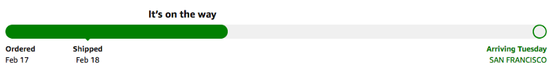 한편 Amazon은 화물 운송 현황을 보여주는 그래프를 다소 모호하게 표현하고 있다. 이게 남은 거리인지 소요 시간인지 명확하지가 않다. 하지만 그 어느쪽이든 문제가 될 것은 없다. 중요한 것은 사용자들이 살짝 보는 것만으로도 화물이 운송되고 있는 중이라는 사실을 알게 해준다는 점이다.