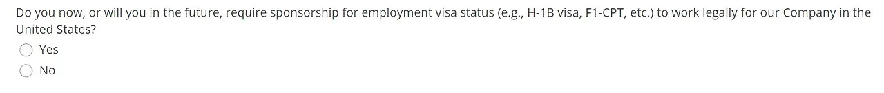"Will you now or in the future require visa sponsorship?"