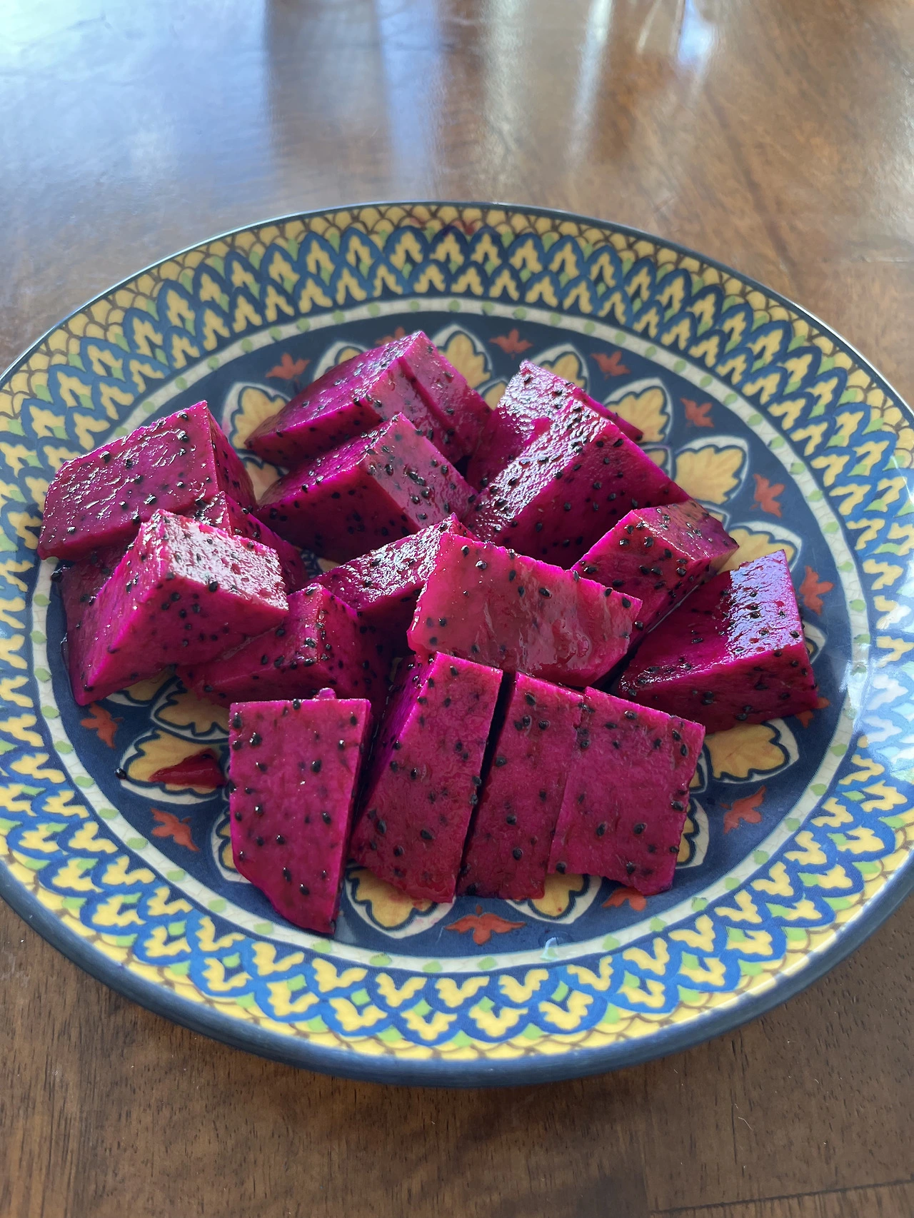 과일의 종류도 다양하다. 가끔은 CFO인 John 아저씨가 '함 잡숴봐'라는 눈빛으로 용과를 가져다주신다. 집에서 잘라보니 난생처음 본 빨간색 용과다. 집 뒤 뜰에 용과나무가 있어서, 열매가 열리면 따다가 박스채로 회사 탕비실에 가져다 놓으신다. 이거슨 뭐랄까 직원 복지에 유기농 과일이 포함되어 있는 느낌 >.<